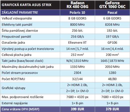 Do výkonnejšieho, ale zase nie veľmi drahého počítača väčšinou padne voľba na strednú triedu, kde doteraz navzájom súperili Radeon RX 380 a konkurenčná karta GeForce GTX 960. Číslovanie sa po dvoch rokoch znovu posunulo k vyššiemu ruka v ruke s menšími (FinFET) tranzistormi. Polaris, čo je kódové označenie pre architektúru AMD GCN4, je vyrábaný 14-nanometrovým a Pascal (nVidia) 16-nanometrovým procesom. Vo výsledku má o niečo väčšiu plochu jadro Radeonu. Prvé svoj náboj vypálilo AMD s RX 480, no nVidia na seba dlho čakať nenechala. Dokonca karty GTX 1060 sa na rozdiel od RX 480 objavili prakticky okamžite v nereferenčných vyhotoveniach, ktorých je medzi Radeonmi stále nedostatok. Aj to je jeden z dôvodov, prečo vám porovnanie prinášame až v druhej vlne, v čase, keď ste už iste v obraze z informácií na webe. Do testu sa nám podarilo obsadiť nereferenčné kusy s identickým chladením od Asusu, nazývaným Strix, vo variante OC (OverClocked). Tie by mali mať výberové čipy zo stredu wafera, schopné vyšších pracovných frekvencií ako nepretaktované modely s referenčnými taktmi. Obe karty majú teda rovnaké podmienky a môžu využívať maximálny potenciál, čo je na objektívne porovnanie dôležité. Chladič na grafických kartách už dávno nerozhoduje iba o tom, či je chod hlučnejší alebo tichší, ale takisto určuje, na akých taktoch bude grafická karta pracovať. Výkonnejší chladič odomyká cestu k vyššiemu automatickému nataktovaniu, čím ovplyvňuje celkový výkon.