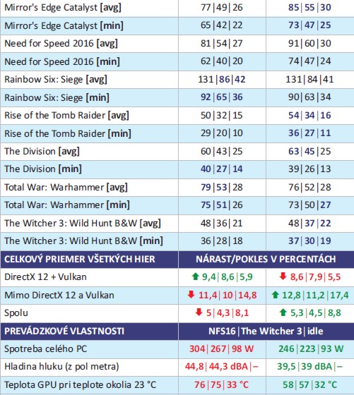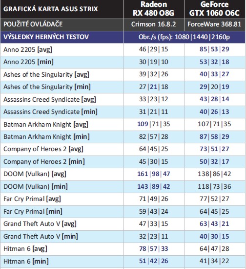 Obrovský náskok má GeForce v budovateľskej stratégii Anno 2205 (takty sú v poriadku a testovali sme aj so staršími Crimsonmi s certifikáciou WHQL). Naprieč všetkými rozlíšeniami má GTX 1060 výrazne navrch takisto v GTA V či v Assassins Creede. V ostatných tituloch to zase až také markantné nie je. Naopak, RX 480 má o poznanie vyšší framerate v DOOMe. Treba však podotknúť, že vysoké čísla, ďaleko za hranicou bezproblémovej plynulosti, má v ňom aj GeForce. Ide o jednu z mála hier, ktorá beží svižne aj v 4K, druhá taká je Rainbox Six: Siege. Tá sa hýbe o málinko (nepostrehnete) rýchlejšie na Radeone, ktorý je o niečo výkonnejší aj v Total War: Warhammer a minimálne fps má RX 480 o chlp vyššie aj v The Division. Citeľne rýchlejší je však iba v Hitmanovi. Najmodernejšie API na urýchlenie používajú asynchrónne jednotky, ktoré Radeony spravujú efektívnejšie, a preto majú pod Dx12 a Vulkanom výraznejší nárast než Pascal, pre ktoré sú novinkou. Predošlý Maxwell ich neovládal, predchádzajúca generácia Radeonov už áno.
