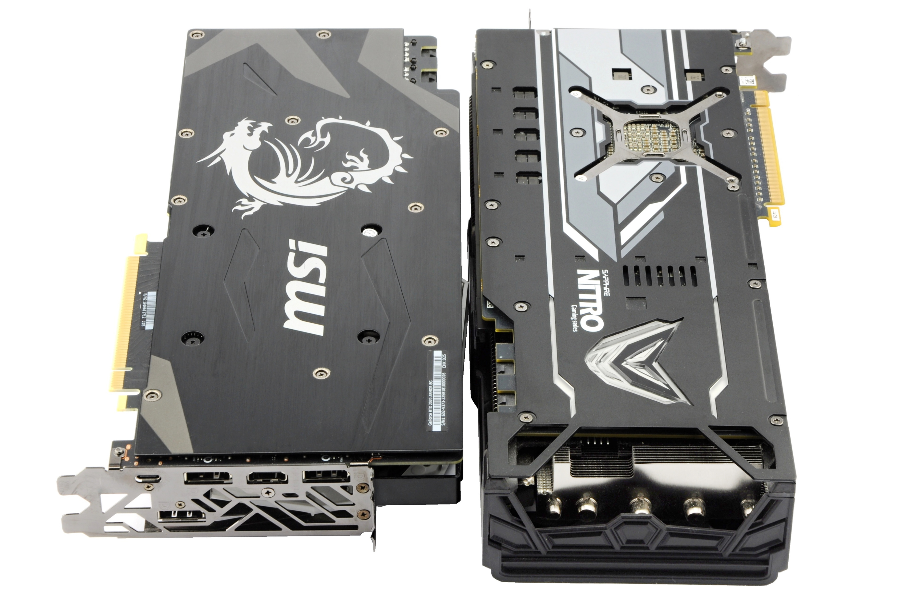 Záber zozadu na backplaty kariet: MSI Armor RTX 2070 8G (vľavo) a Sapphire Nitro+ Vega 64 (vpravo)