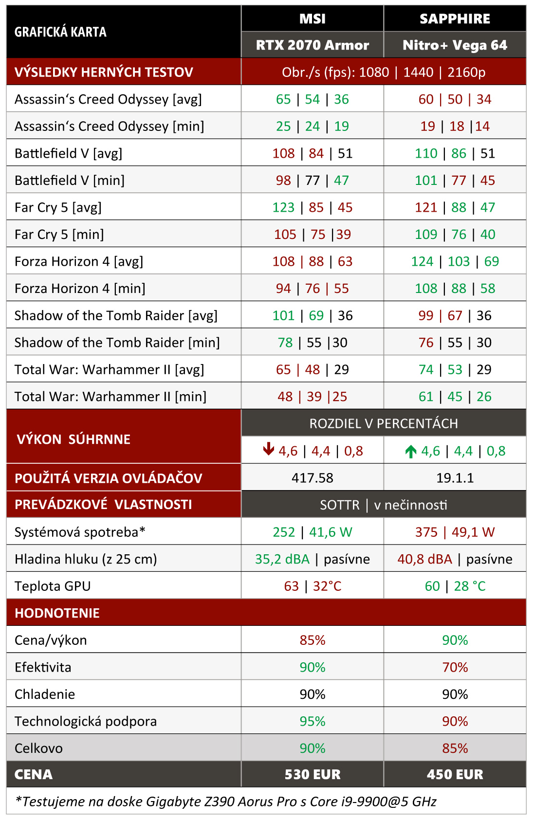 Jedna i druhá karta sú vhodné na hranie v rozlíšení QHD alebo vo FHD v prípade, že vlastníte vysokofrekvenčný monitor s adaptívnym obnovovaním. Ak je jasnou prioritou pomer cena/výkon, je o trochu zaujímavejšia Sapphire Nitro+ Vega 64. Pokiaľ však hľadáte komplexne vyváženú kartu, určite má zmysel si priplatiť. I s ohľadom na to, že vám stačí slabší/lacnejší zdroj. A z dlhodobého hľadiska nie je zanedbateľná ani návratnosť na poplatkoch za energie vďaka podstatne úspornejšiemu chodu MSI RTX 2070 Armor 8G.
