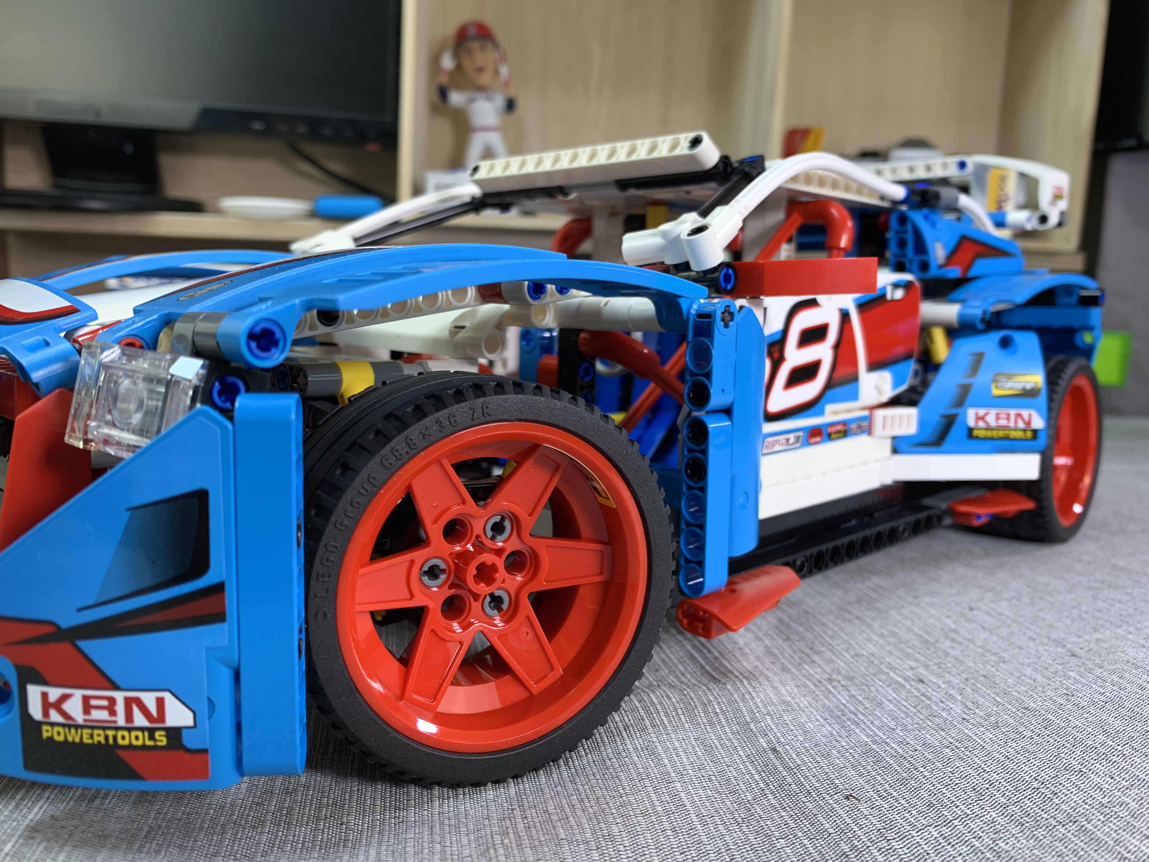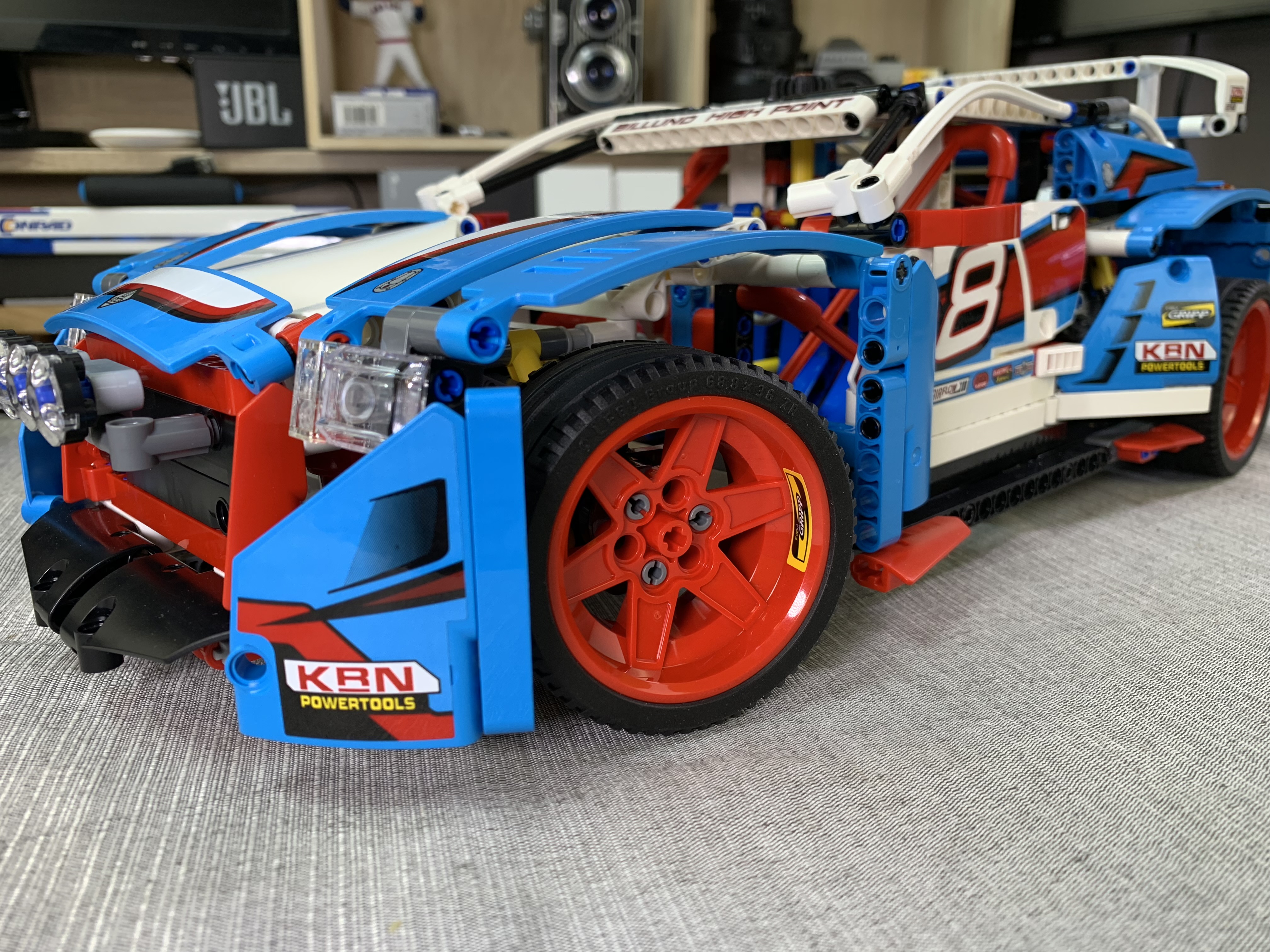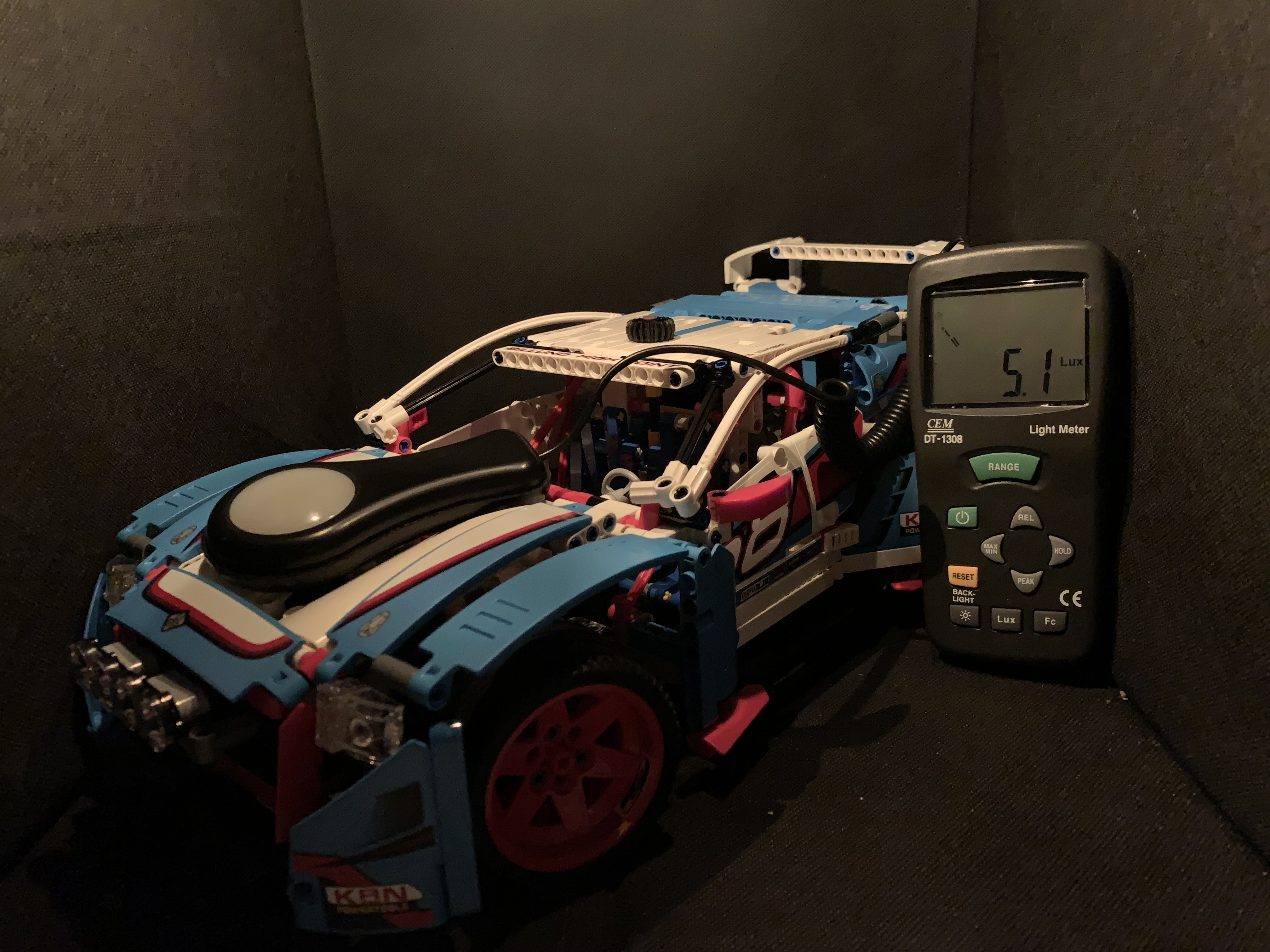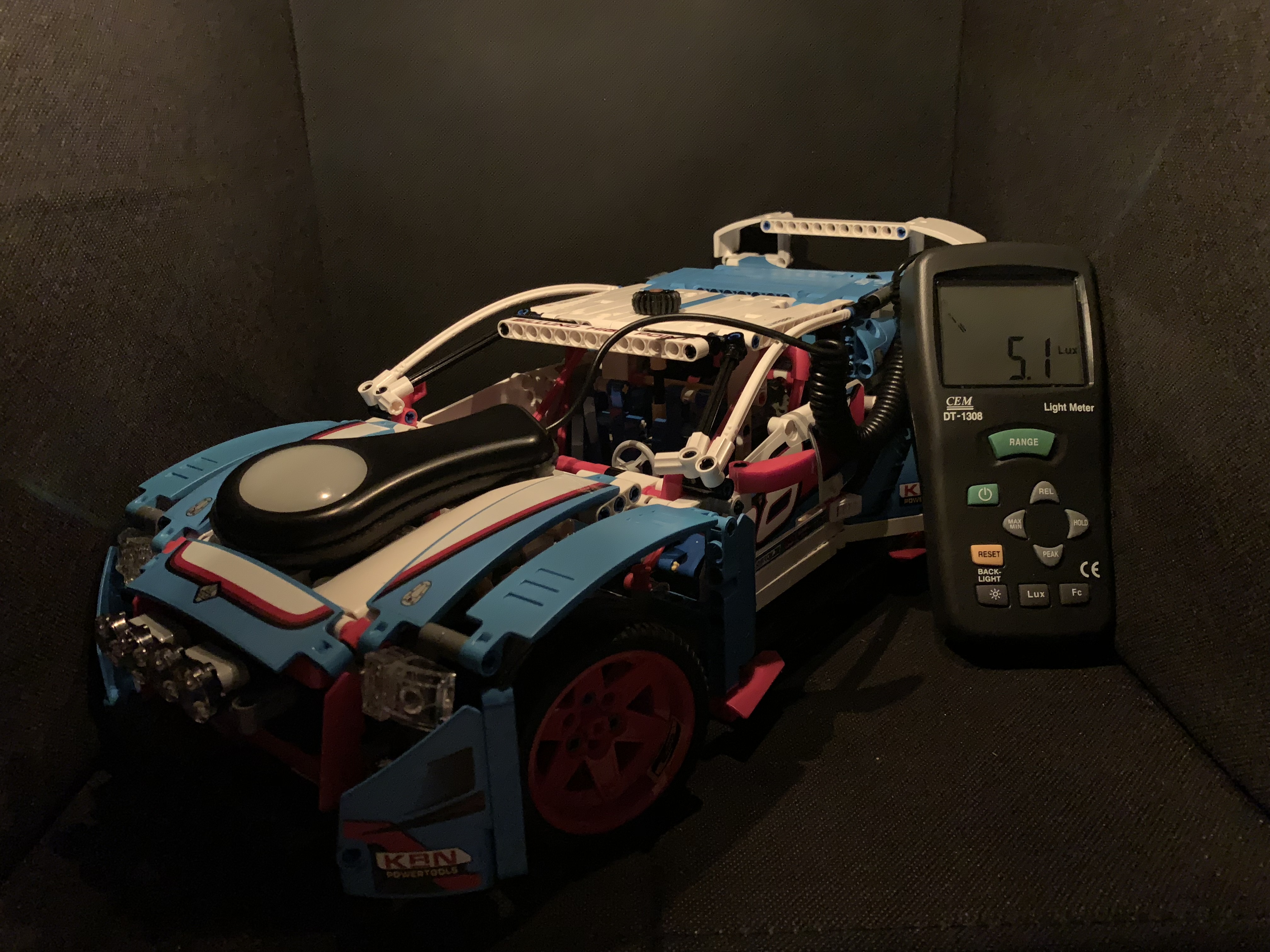 Na tomto modeli auta z Lega v životnej veľkosti v pomerne dobre osvetlenom interiéri sú obidve fotky plné detailov. Na prednom spojleri zo svetlo sivých kociek vidno, že s určením farebnej teploty a vyvážením bielej farby si lepšie poradil iPhone XR.