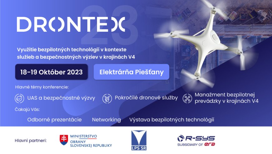 V termíne 18-19. Októbra 2023 sa v priestoroch národnej kultúrnej pamiatky Elektrárňa Piešťany uskutoční druhý ročník odbornej medzinárodnej konferencie DRONTEX 2023 zameranej na bezpilotné technológie a ich využitie v štátnej správe, priemysle a službách v krajinách V4. Okrem odborných prezentácií konferencia ponúkne výstavu bezpilotných systémov v EXPO stane, ako aj atraktívny sprievodný program a priestor pre networking.