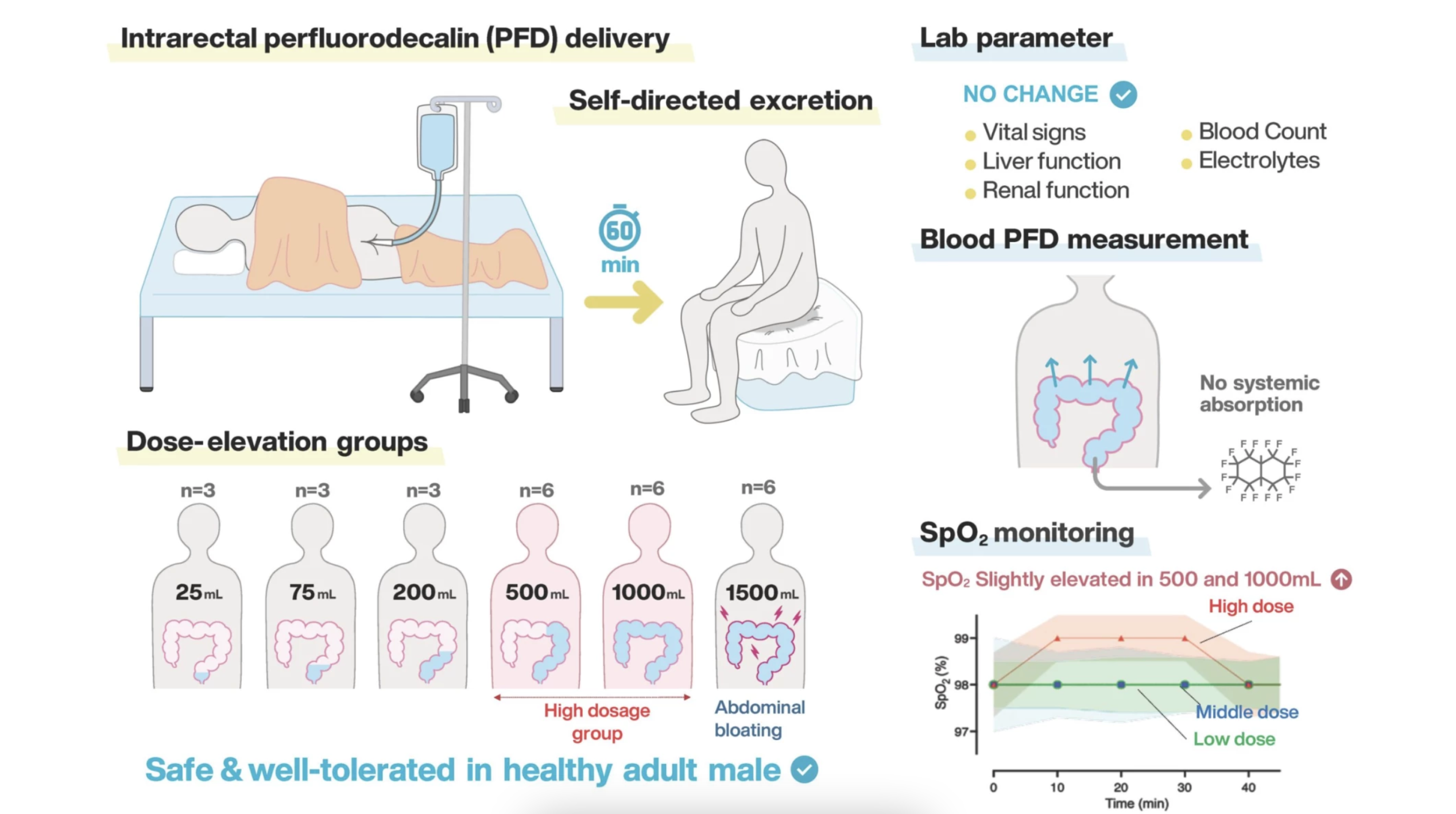 Na štúdii sa zúčastnilo 27 zdravých mužských dobrovoľníkov z Japonska vo veku od 20 do 45 rokov, ktorým bola do konečníka podaná jednorazová dávka perfluórdekalínu bez obsahu kyslíka. Úlohou dobrovoľníkov bolo udržať v sebe kvapalinu, ktorej objem v niektorých prípadoch dosiahol až 1.5 litra, po dobu 60 minút.
