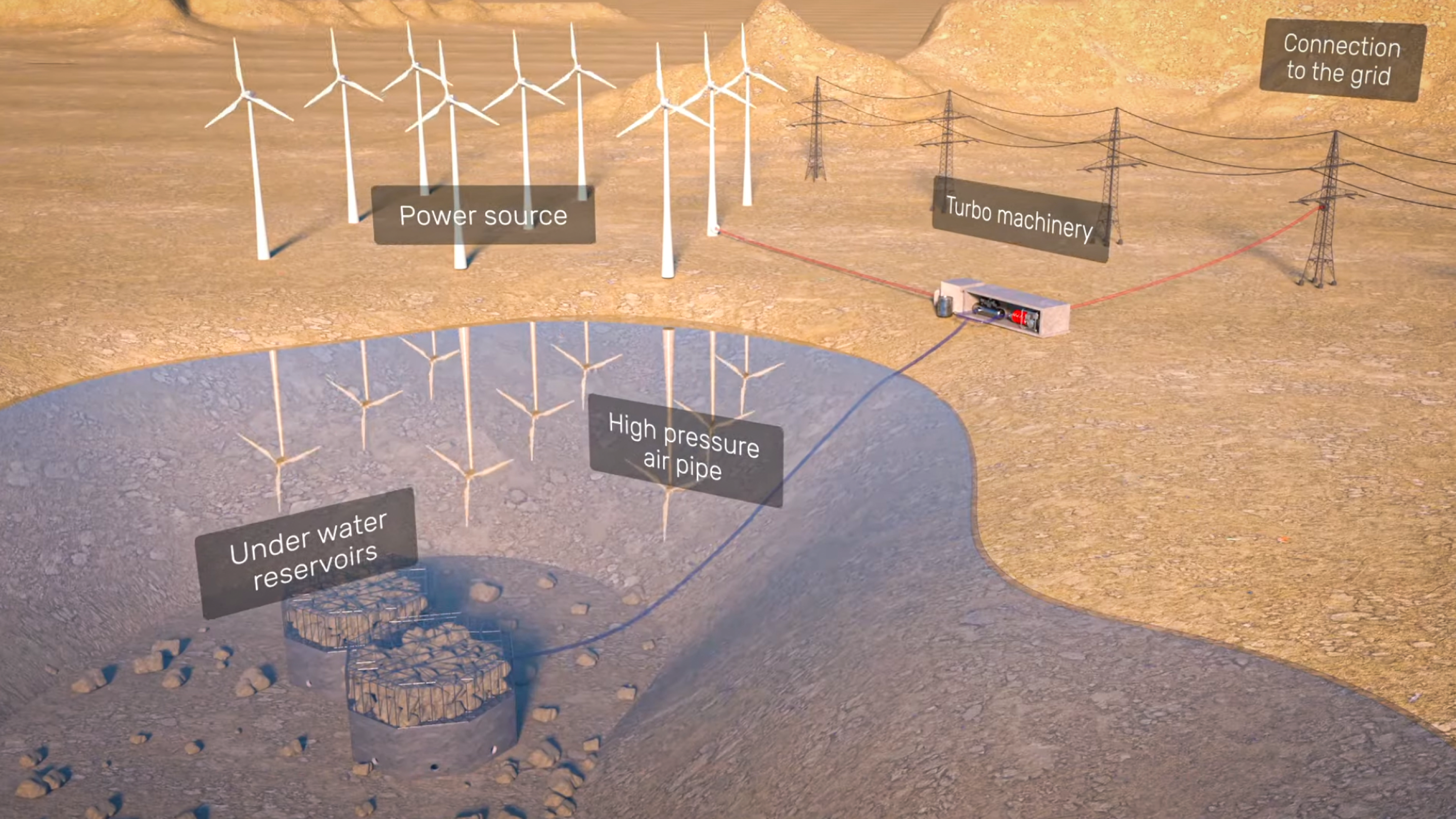Systém zahŕňa sériu veľkých betónových a oceľových nádrží so skalami navrchu, ktoré ich udržujú ponorené v hĺbke až 700 metrov. Tieto nádrže sú naplnené morskou vodou a majú ventily prepúšťajúce vodu. Pri prebytku energie sa do nádrží cez dlhé hadice privádza okolitý vzduch, ktorý sa stlačí a vytlačí vodu. Keď je čas na obnovenie energie, vzduch sa hadicou vracia späť do systému tepelnej rekuperácie a turboexpander poháňa generátor.