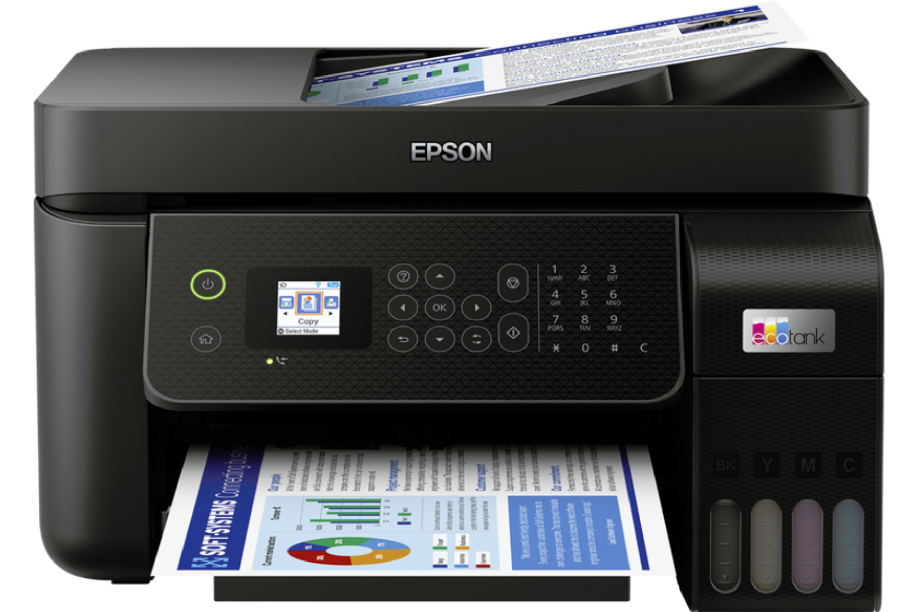 Dizajn zariadenia zohľadňuje potreby používateľov, ktorí ocenia jednoduché ovládanie a úsporu miesta. S rozmermi 375 × 237 × 347 mm sa zmestí na pracovný stôl, poličku alebo menšiu skrinku bez toho, aby narušila organizáciu priestoru. Výrazný prvok je automatický duplexný podávač dokumentov (ADF), ktorý uľahčuje spracovanie viacstranových dokumentov pri kopírovaní či skenovaní a podporuje aj obojstranné skenovanie, čo zvyšuje produktivitu. Ovládací panel s 1,44-palcovým farebným LCD displejom ponúka prehľadné menu, no nejde o dotykovú obrazovku, takže ovládanie sa realizuje pomocou fyzických tlačidiel. Epson myslel aj na pohodlné dopĺňanie atramentu – fľaštičky majú mechanizmus proti rozliatiu a zásobníky sú prístupné spredu, čím odpadá potreba manipulovať s tlačiarňou alebo otvárať viacero krytov. Krytka na doplňovanie je v pravom hornom rohu dobre prístupná.