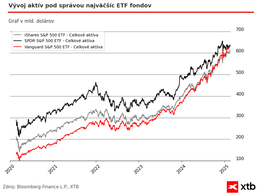 ,,Dlhé roky bol svetovou jednotkou v oblasti ETF fondov najznámejší americký akciový index S&P 500 fond so skratkou SPY od spoločnosti State Street. Pred pár dňami ho však v objeme spravovaných aktív prekonal fond so skratkou VOO od konkurenčnej spoločnosti Vanguard. Vo fonde od Vanguardu je momentálne už 632 miliárd USD. Od začiatku tohto roka doň pritieklo 23 miliárd USD. Vo fonde SPY je momentálne 630 miliárd USD (graf),“ hovorí Tomáš Vranka, analytik finančných trhov XTB.