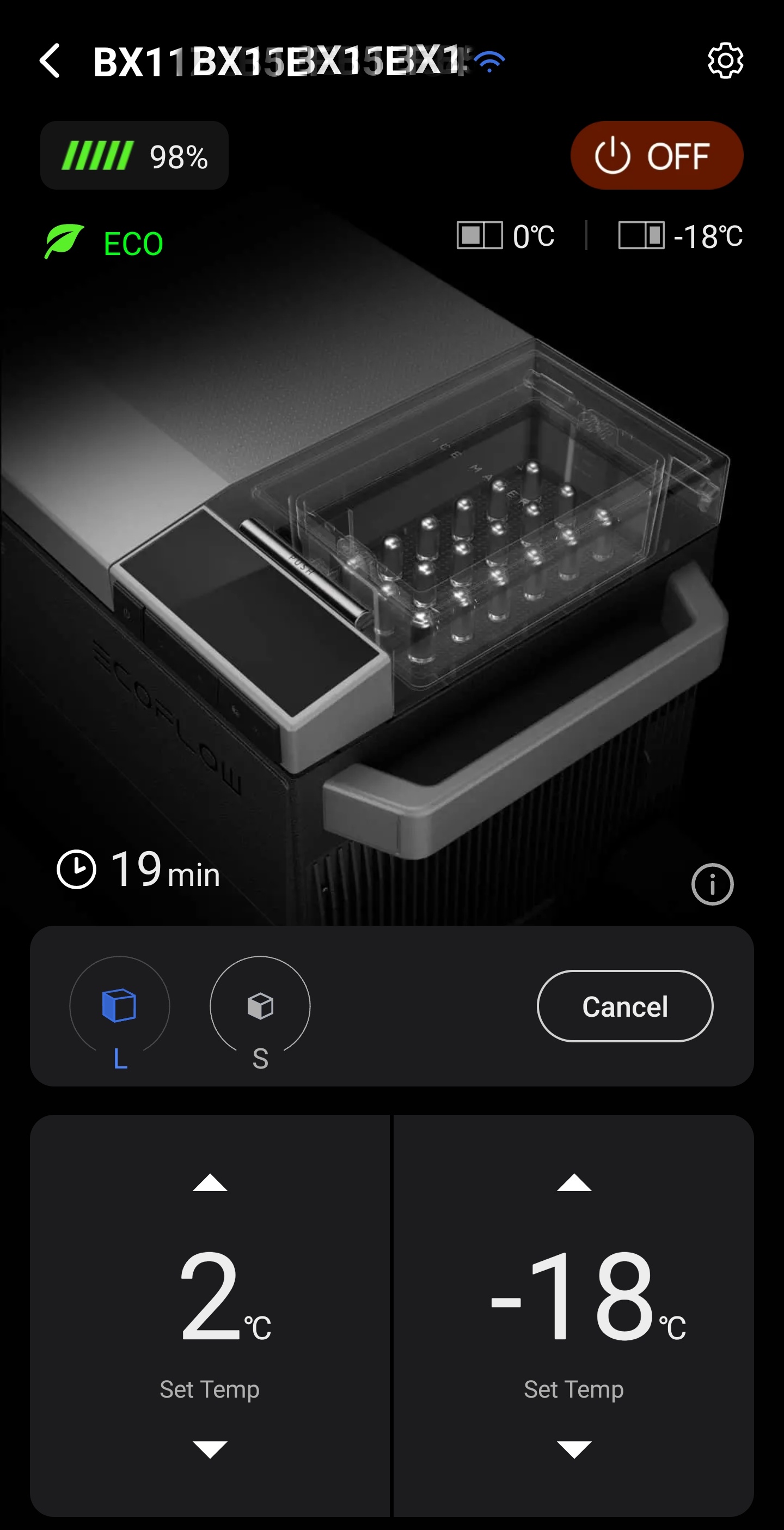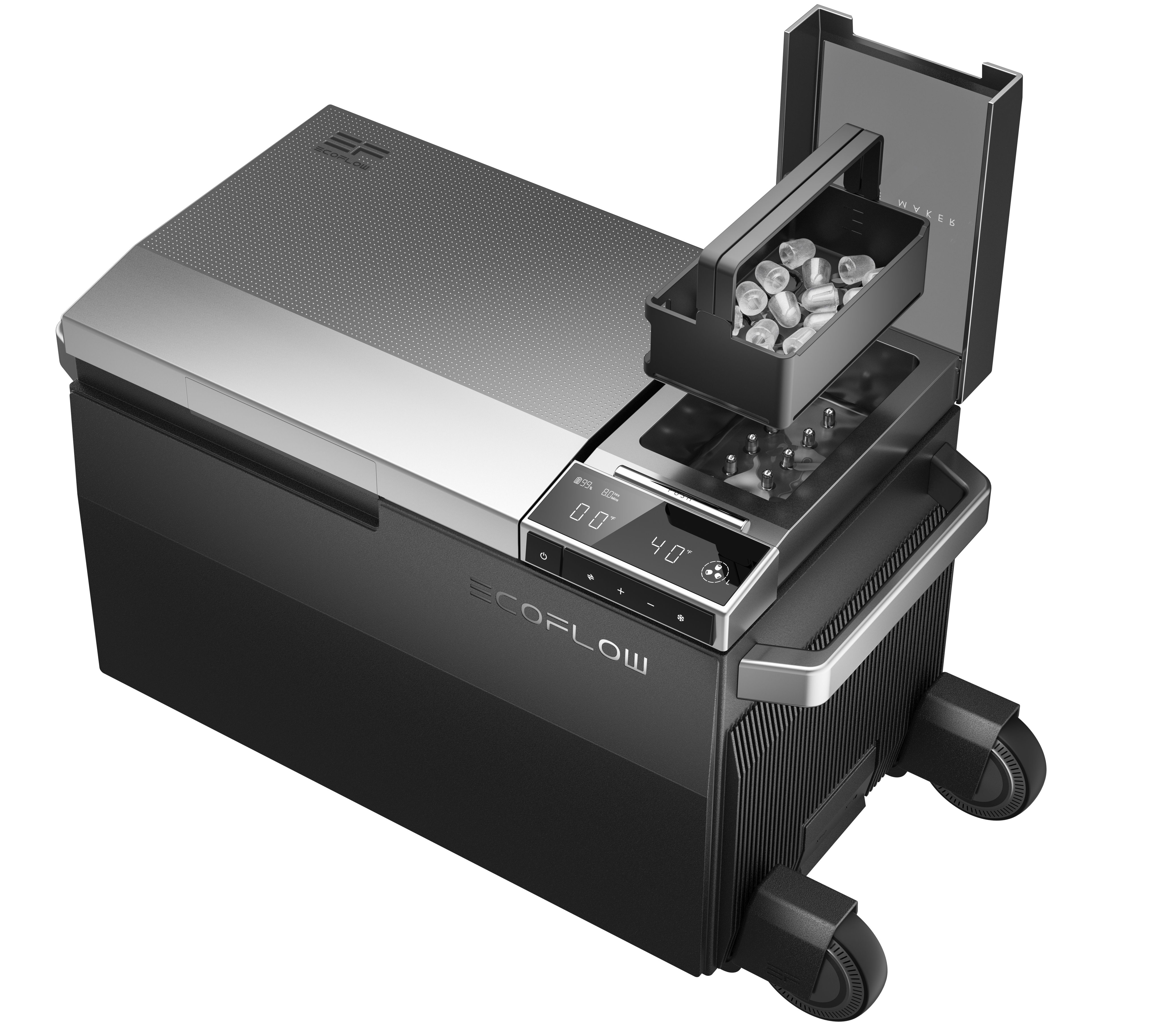 Ďalší veľký benefit je možnosť diaľkového ovládania z mobilnej aplikácie EcoFlow. Tu však konštruktéri naozaj rozmýšľali a vo výbave nájdete rovno konektivitu bluetooth aj Wi-Fi. Ak ste niekde mimo civilizácie, možno na ovládanie využiť bluetooth, a ak máte k dispozícii Wi-Fi, môžete sa k chladničke pripojiť neobmedzene cez internet. Po nastavení, keď spustíte aplikáciu EcoFlow, tá sa k zariadeniu pripojí automaticky podľa toho, aké pripojenie je práve dostupné. V aplikácii môžete ovládať všetko, čo aj z predného panela, pri výrobe ľadu máte takisto možnosť vybrať jednu z dvoch veľkostí ľadových kociek.
