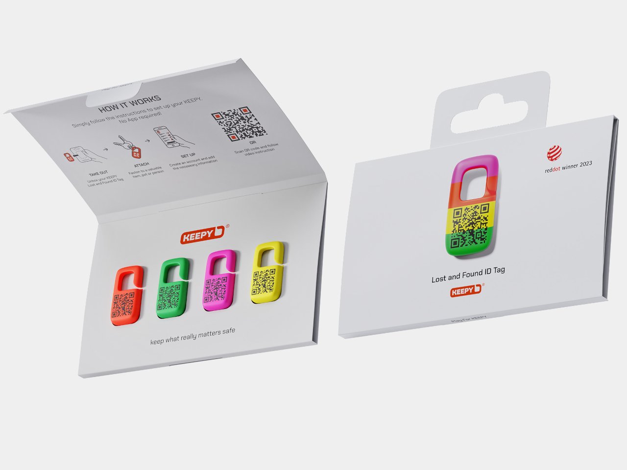 Dodáva sa v jasných farbách vrátane oranžovej, žltej, zelenej a ružovej, čo je zámerná voľba, ktorá dramaticky zvyšuje jeho viditeľnosť a pravdepodobnosť, že si ho nálezca všimne. Je vybavený veľkým výrezom a bezpečným uzamykacím mechanizmom, ktorý umožňuje jeho pripevnenie prakticky na čokoľvek dôležité.