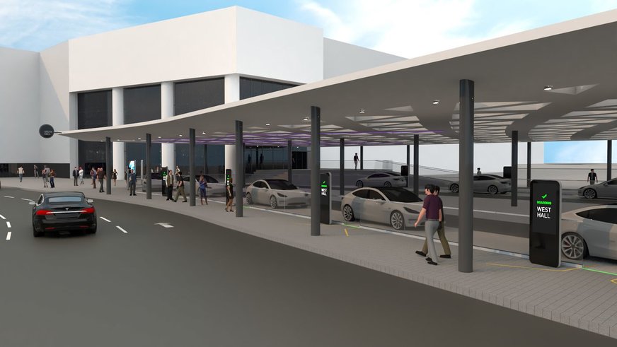 Pri pohľade z eskalátora vidno dole niekoľko zaparkovaných elektrických vozidiel Tesla Model 3. Je to jedno z plánovaných vozidiel, ktoré bez šoférov dopravia ľudí z jedného konca konferenčného centra v Las Vegas na druhý. Veľká obrazovka vpredu označuje odchod vozidiel, pričom každé z nich má priradené číslo, podľa ktorého možno určiť, na ktoré miesto v kongresovom centre majú namierené.