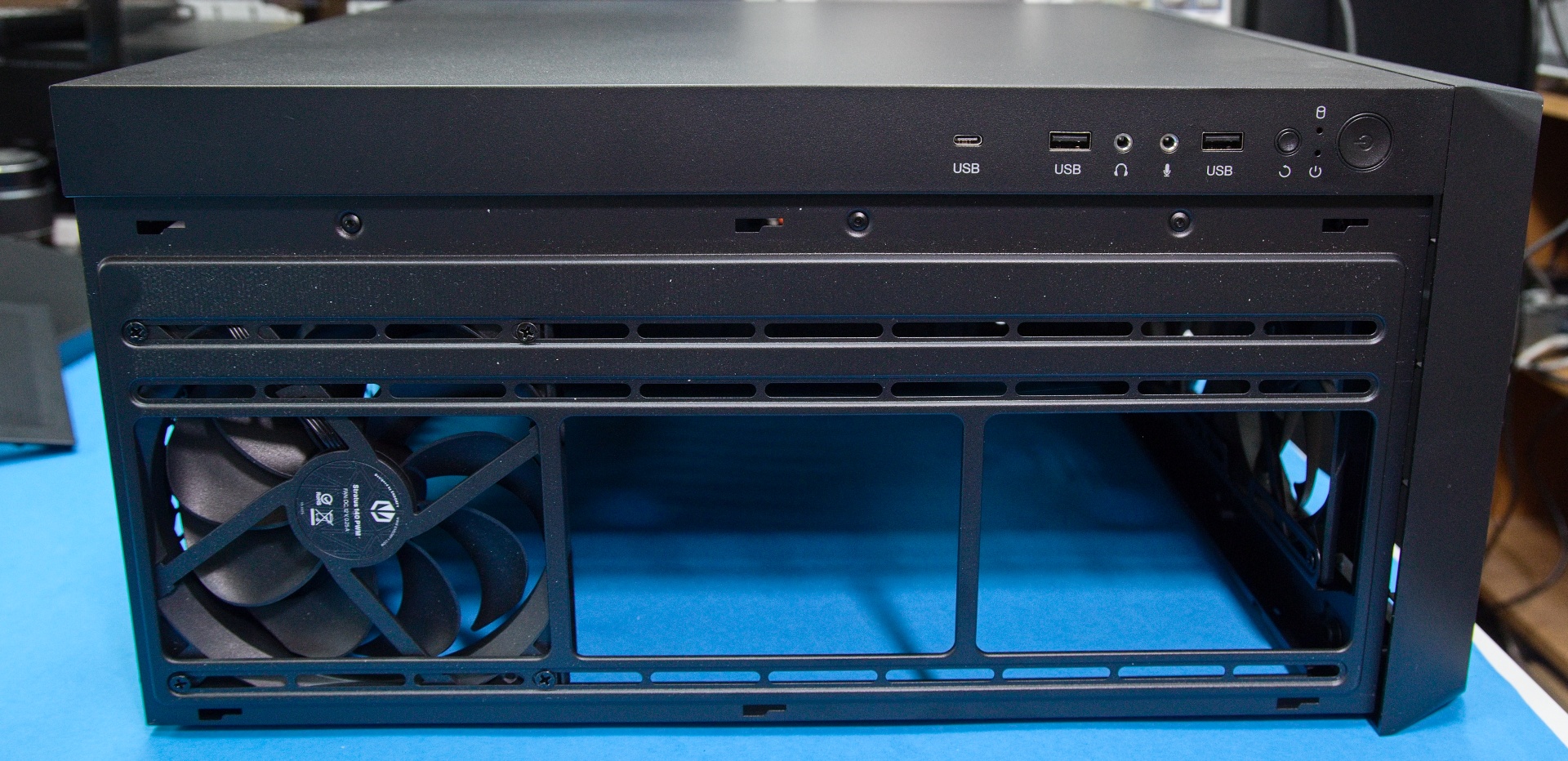 Prenikaniu hrubších častíc prachu bránia odnímateľné sitká vpredu aj v hornej a dolnej časti. Hore je rám so sitkom uchytený vzadu skrutkou, takže sa neposúva. Spodný filter je prichytený magneticky a navyše sa zasúva do drážky. Potešili by nylonové filtre, ktoré by zachytili aj jemnejší prach. Nie je problém taký filter z vhodného materiálu vystrihnúť a umiestniť ho pod hrubší filter. Predná stena je vďaka magnetickému uchyteniu ľahko odoberateľná. Rám s tromi prednými ventilátormi sa dá odobrať ako celok, čo zjednodušuje montáž a správu káblov. Vďaka výške nožičiek je pod skrinkou dostatok miesta na nasávanie vzduchu do priestoru napájacieho zdroja.