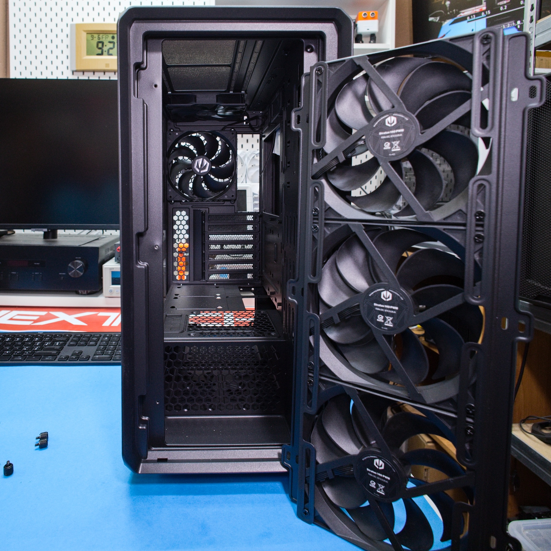 K dispozícii sú ešte tri ďalšie pozície na 140 alebo 120 mm ventilátory. Päť predinštalovaných ventilátorov je zapojených do rozbočovača, takže k základnej doske sa pripájajú jedným káblom. Na hornú stenu sa dá umiestniť radiátor vodného chladenia do veľkosti 280/360 mm. Ventilátory Stratus 140 PWM porovnaní so 120 mm ventilátormi umožňujú v závislosti od režimu aktuálnej záťaže buď intenzívnejšie, alebo vďaka vyššej efektívnosti ventilátorov s väčším priemerom tichšie chladenie.