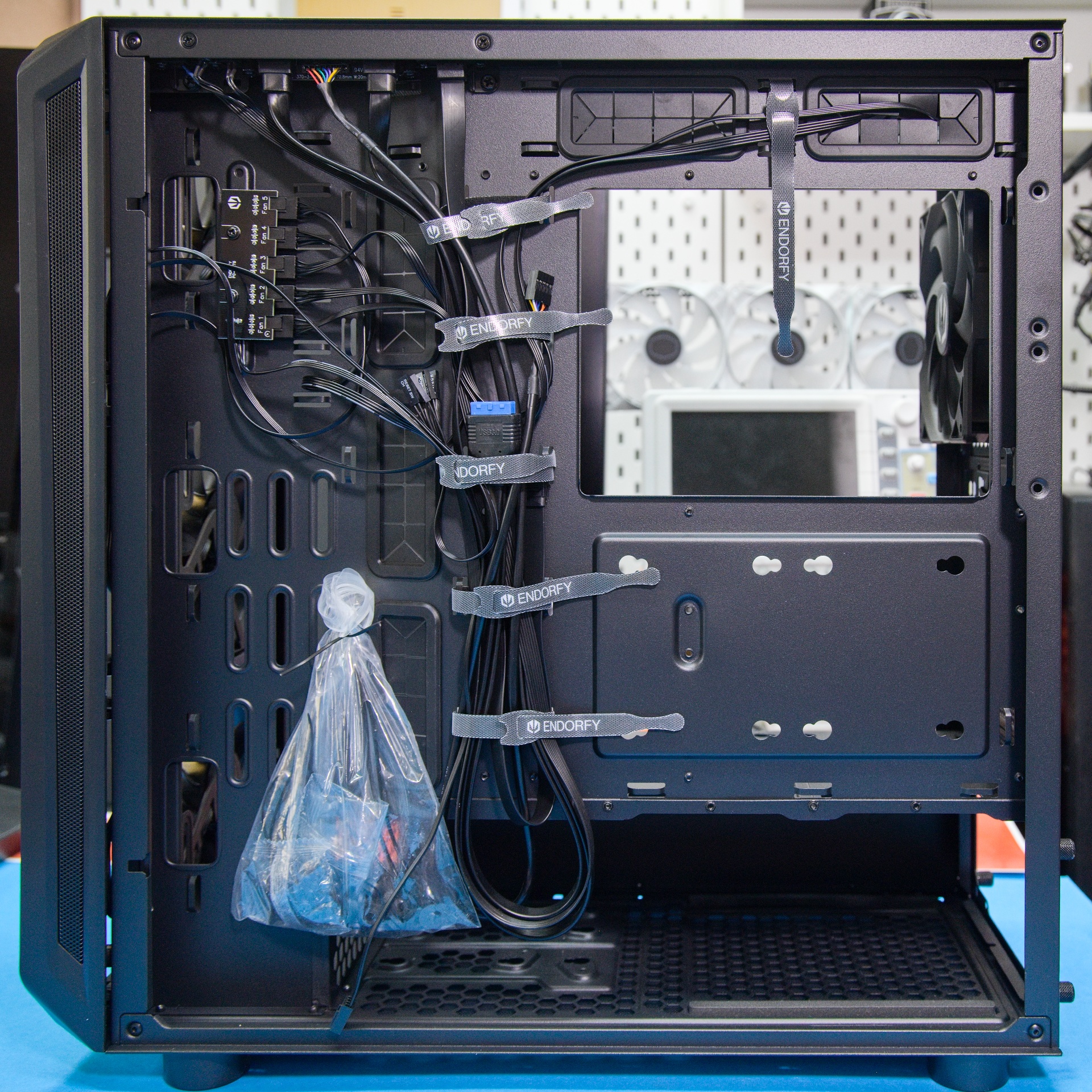 Tri veľké priechodky pre káble majú gumené tesniace kryty so šírkou 24 mm, takže nimi ľahko prevlečiete aj hrubšie káble či konektory. Ďalšie dve priechodky sú v hornej časti pod základnou doskou. V zadnej časti je pripravených šesť sťahovacích pások na čo najprehľadnejšie umiestnenie káblov.