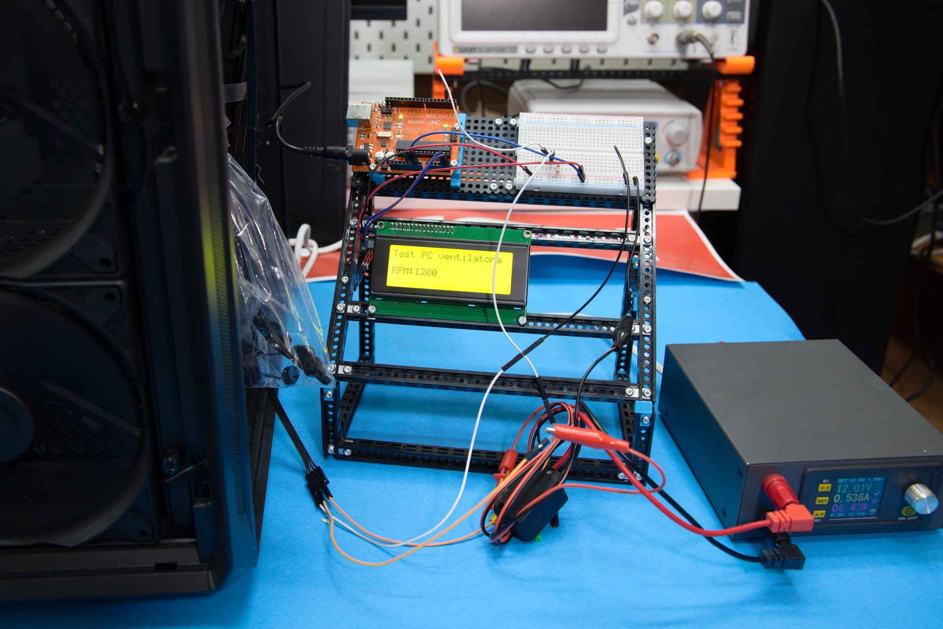 Ventilátory majú pri menovitom napätí rýchlosť 1200 ot./min. Pomocou prípravku s Arduinom, ktoré sníma signál na konektore ventilátorov, som nameral 1260 ot./min. Ako napovedá označenie Stratus 140 PWM, ventilátory podporujú aj reguláciu PWM. Pri teste pomocou signálu PWM z generátora (25 kHz, 5 V) som zistil, že vrtule ventilátorov sa zastavia pri poklese šírky impulzov pod 5 % a rozbehnú sa nad 10 %. V oblasti medzi 5 a 10 % sa ventilátory nerozbehnú, takže ak vhodne nastavíte krivku priebehu, dosiahnete v tejto oblasti semipasívne chladenie. Pri plnom výkone má všetkých päť ventilátorov spolu spotrebu len 6,3 W.