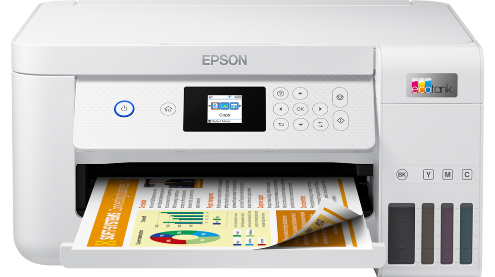Atramentová farebná tlačiareň kombinovaná so skenerom je primárne určená pre domácich používateľov, home office, prípadne živnostníkov. Prívlastok EcoTank prezrádza, že tlačiareň umožňuje dopĺňanie atramentu, čo v praxi znamená veľmi nízke náklady na tlač. Dopĺňanie atramentov je oveľa ekonomickejšia a ekologickejšia metóda než vymieňanie kaziet pre jednotlivé farby. Platíte totiž len za atrament, a nie za kazety, ktoré obsahujú viac alebo menej zložitý mechanizmus na dodávanie atramentu do tlačovej hlavy. Priesvitné nádobky za okienkami telesa zásobníkov na tonery umiestneného vpravo dole umožňujú letmým pohľadom skontrolovať hladiny v jednotlivých zásobníkoch.