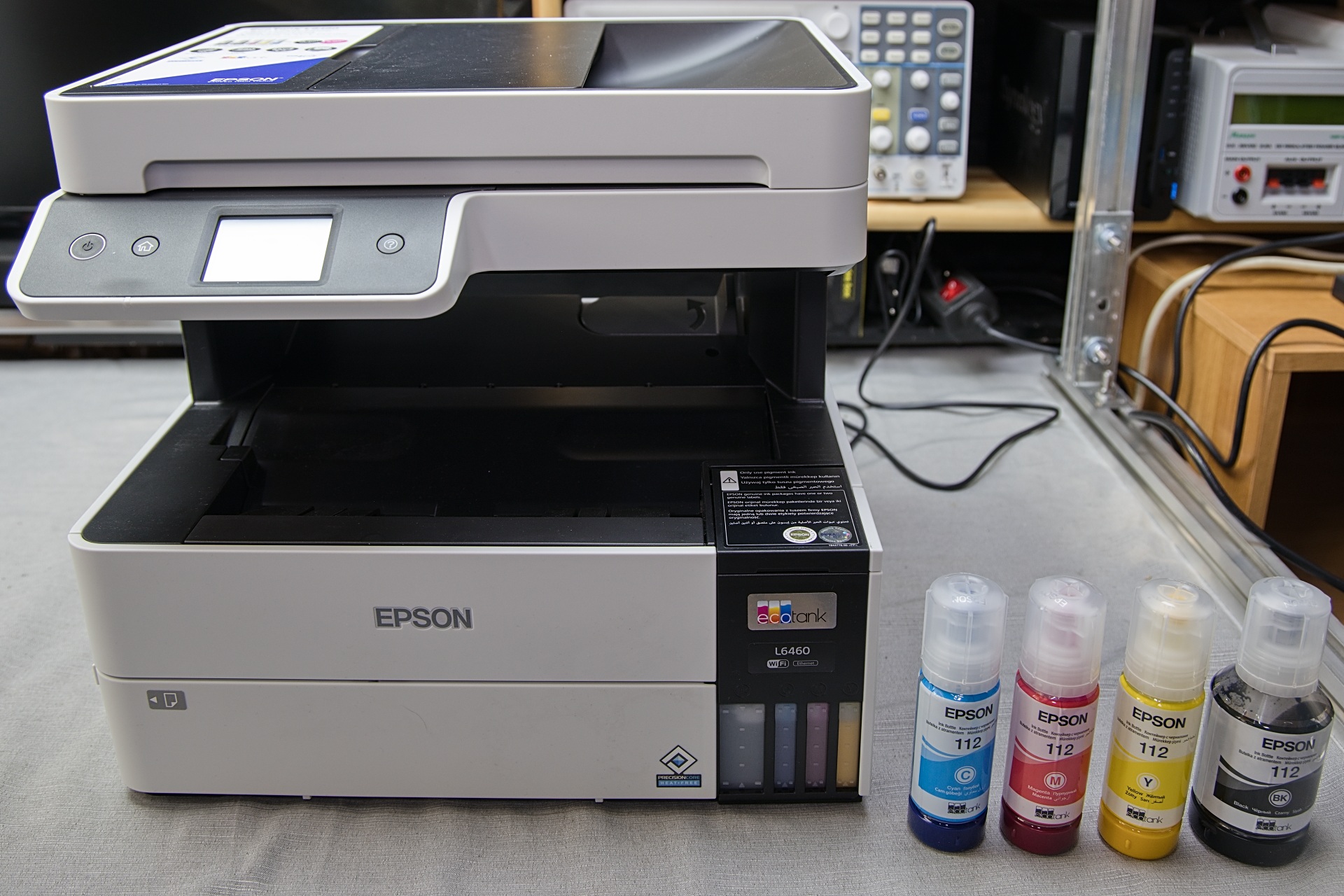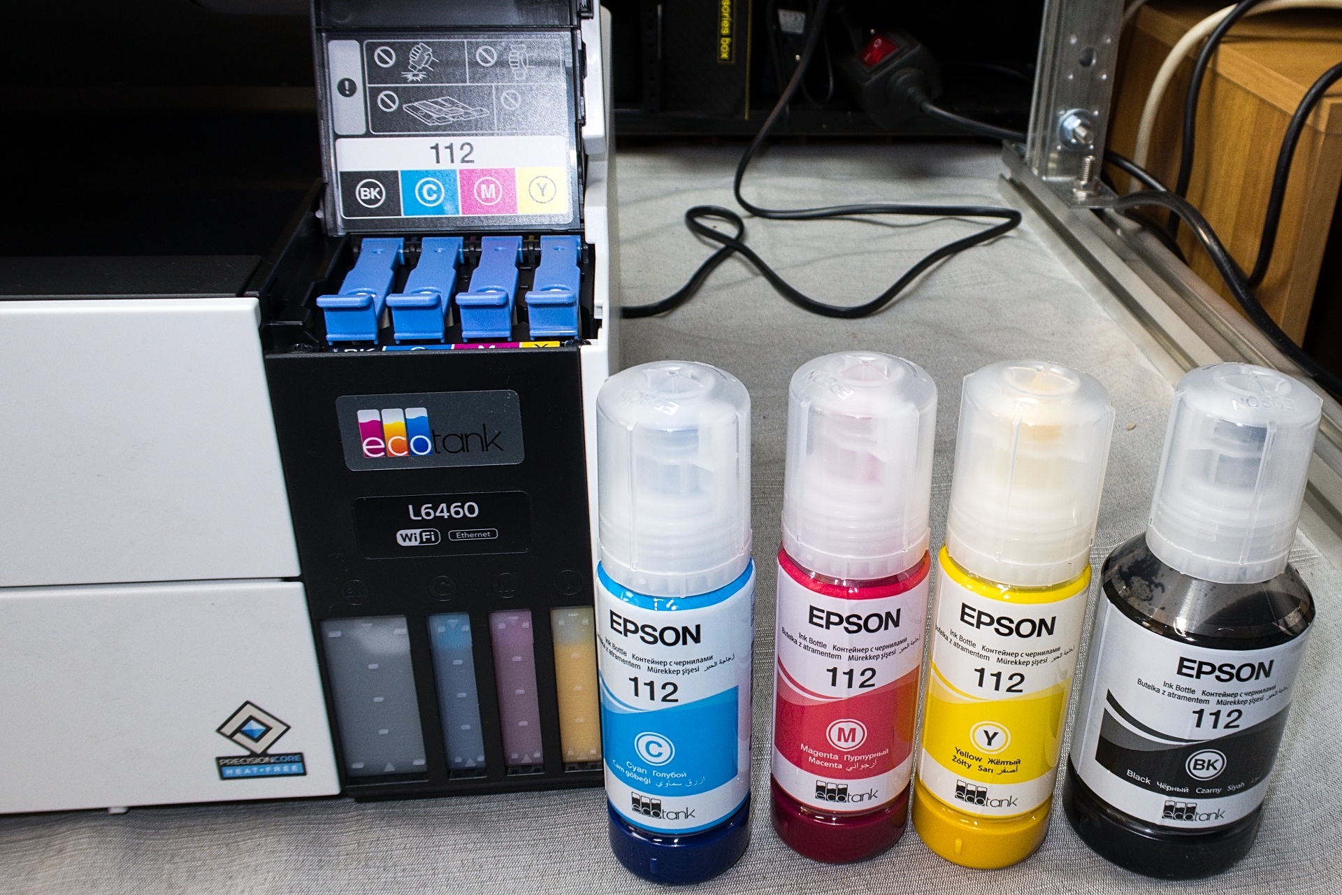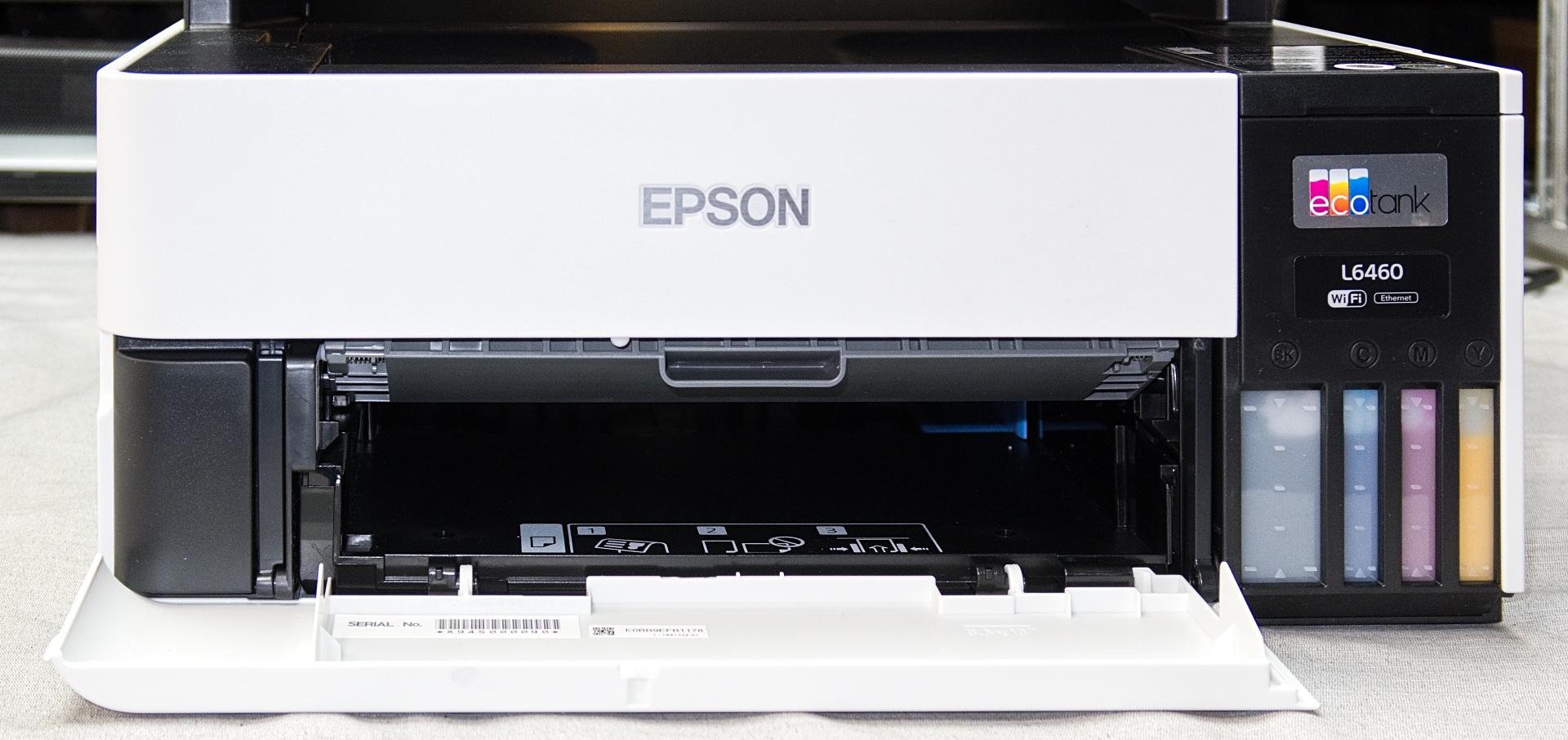 Štyri zásobníky na azúrový, purpurový, žltý a čierny atrament avizujú farebný model CMYK. Absencia zásobníkov na doplnkové farby prezrádza, že sa nejedná o typickú fototlačiareň, napriek tomu farebné obrázky a biznis grafika sa vytlačí v dobrej kvalite. Naplnenie zásobníkov pri novej tlačiarni, či dopĺňanie atramentu je otázkou jednej – dvoch minút. Stačí nadvihnúť samostatný kryt uzáverov zásobníkov, postupne ich otvárať a dopĺňať príslušný atrament. Vďaka konštrukcii uzáverov zvládne dopĺňanie atramentov skutočne každý a pokojne tak môže urobiť aj v biznis obleku a bielej košeli bez rizika ušpinenia rúk.