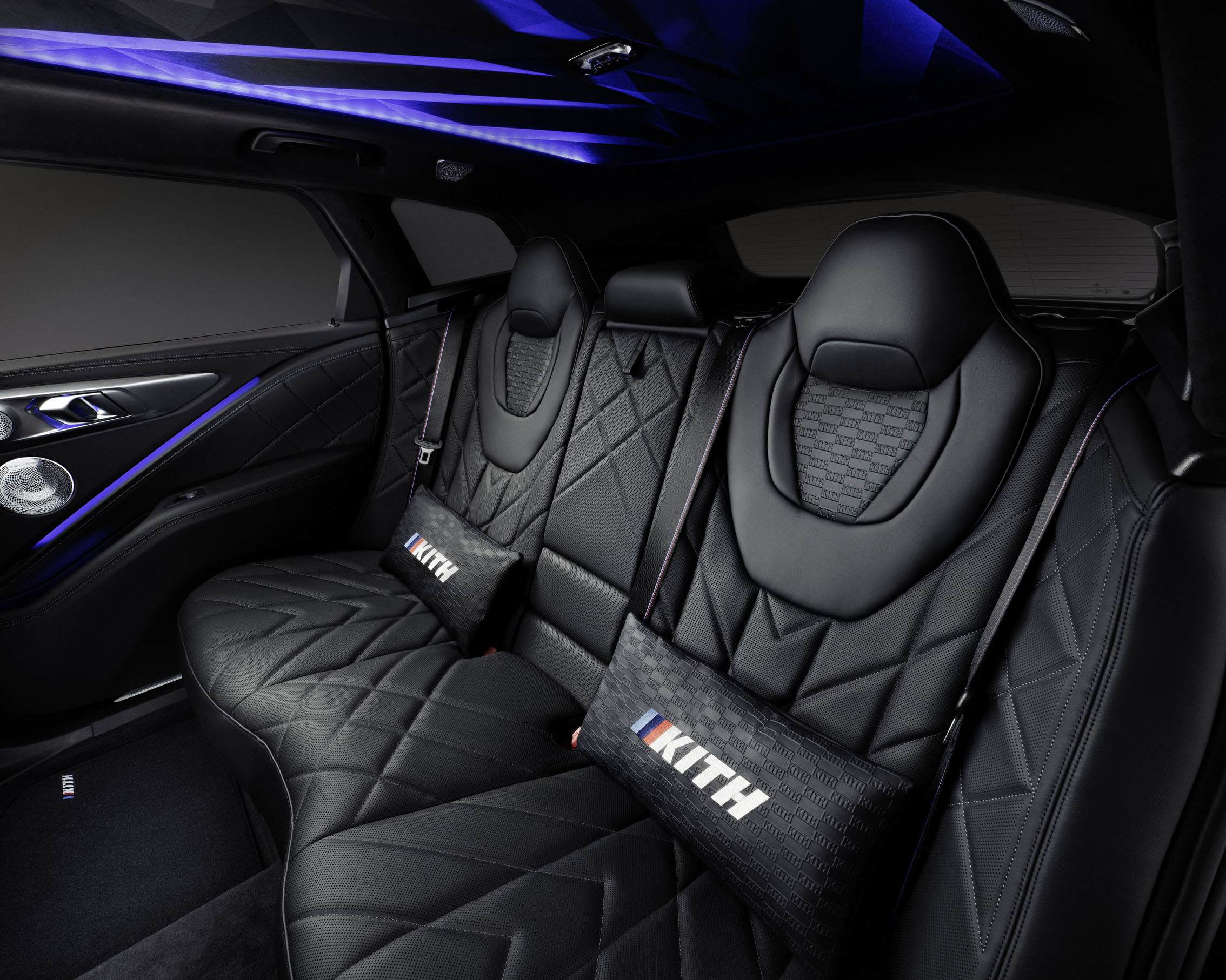 Osobitú atmosféru vytvára M Lounge v zadnej časti vozidla 2025 BMW XM by Kith. Dotvárajú ju aj reliéfny monogram Kith na povrchoch sedadiel a dva vankúše s logom. Spolu s prednastaveným fialovým osvetlením interiéru tak vzniká nezameniteľná atmosféra, ktorá sa hodí k vozidlu danej edície.