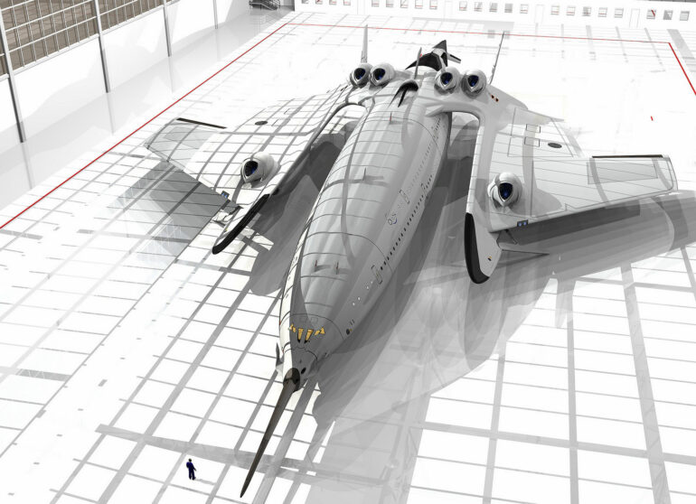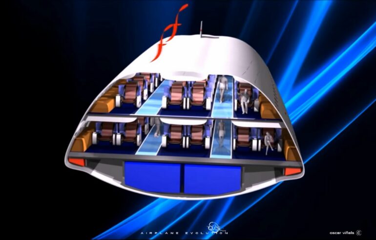 Vnútri sú dve paluby so sedadlami v obchodnej triede hore a sedeniami v „superturistickej triede“ na palube pod ňou. Podľa dizajnéra by lietadlo mohlo pohodlne prepravovať až 250 cestujúcich. Priamo pod palubou pre cestujúcich je priestor na náklad, kde je vyhradené miesto aj pre veľké, vysokokapacitné grafénové batérie pre hybridné motory. Nekonvenčný je aj dizajn krídel. Tie vyzerajú ako jedna obrovská konštrukcia, sú pripevnené k trupu vzadu, ale siahajú až dopredu.