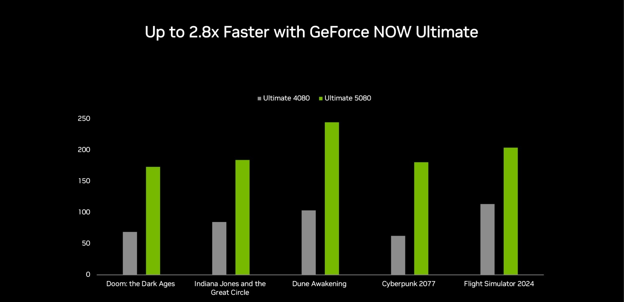 Najnovšia architektúra GPU ponúka až 2,8-krát vyššiu snímkovú frekvenciu v porovnaní so servermi predchádzajúcej generácie a viac ako trojnásobne predbehne PlayStation 5 Pro. A v kombinácii s najnovšími procesormi AMD „Zen 5“ a NVIDIA ConnectX®-7 SmartNICs ponúka GeForce NOW najmodernejší hardvér v oblasti cloudového hrania.