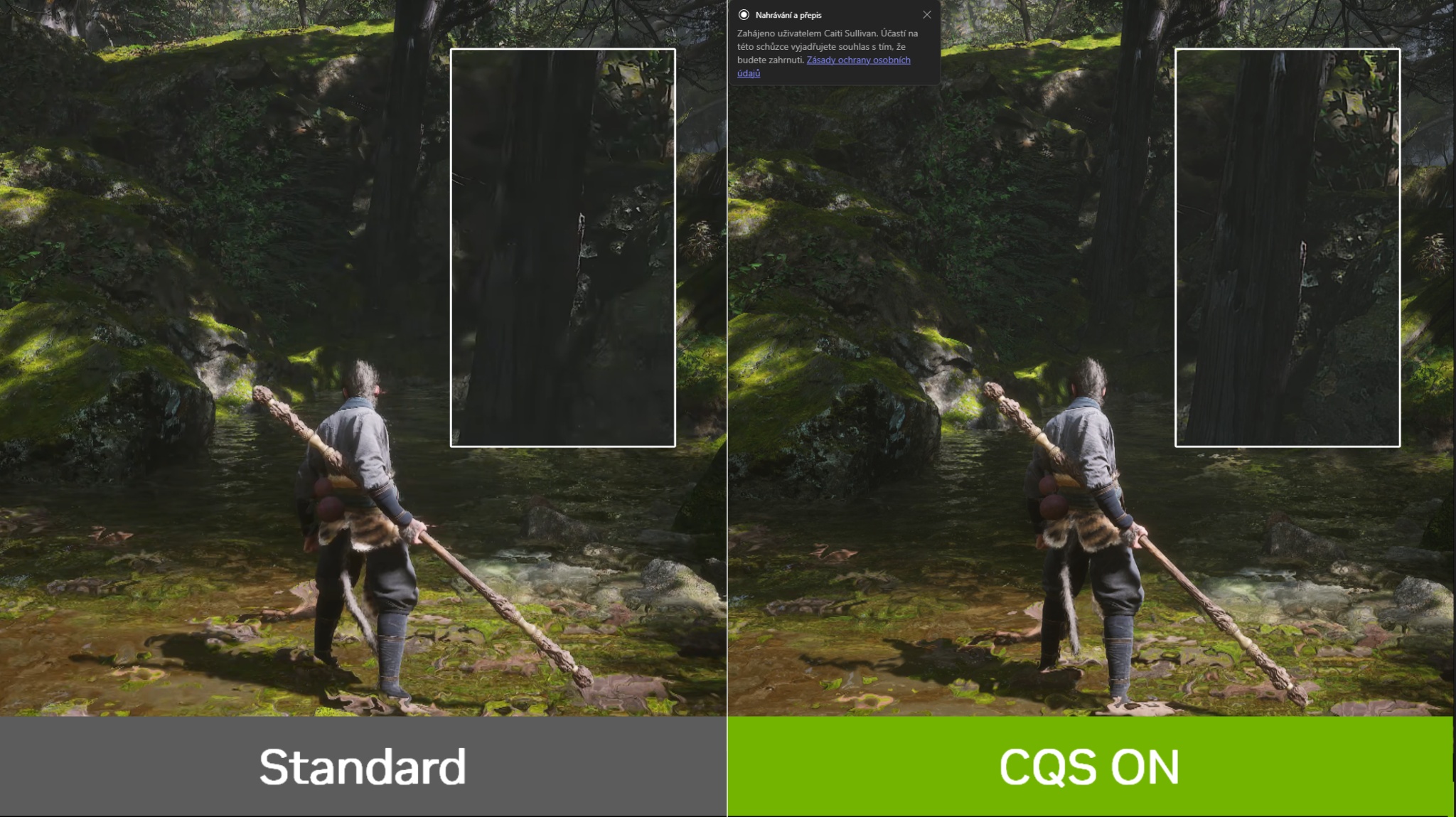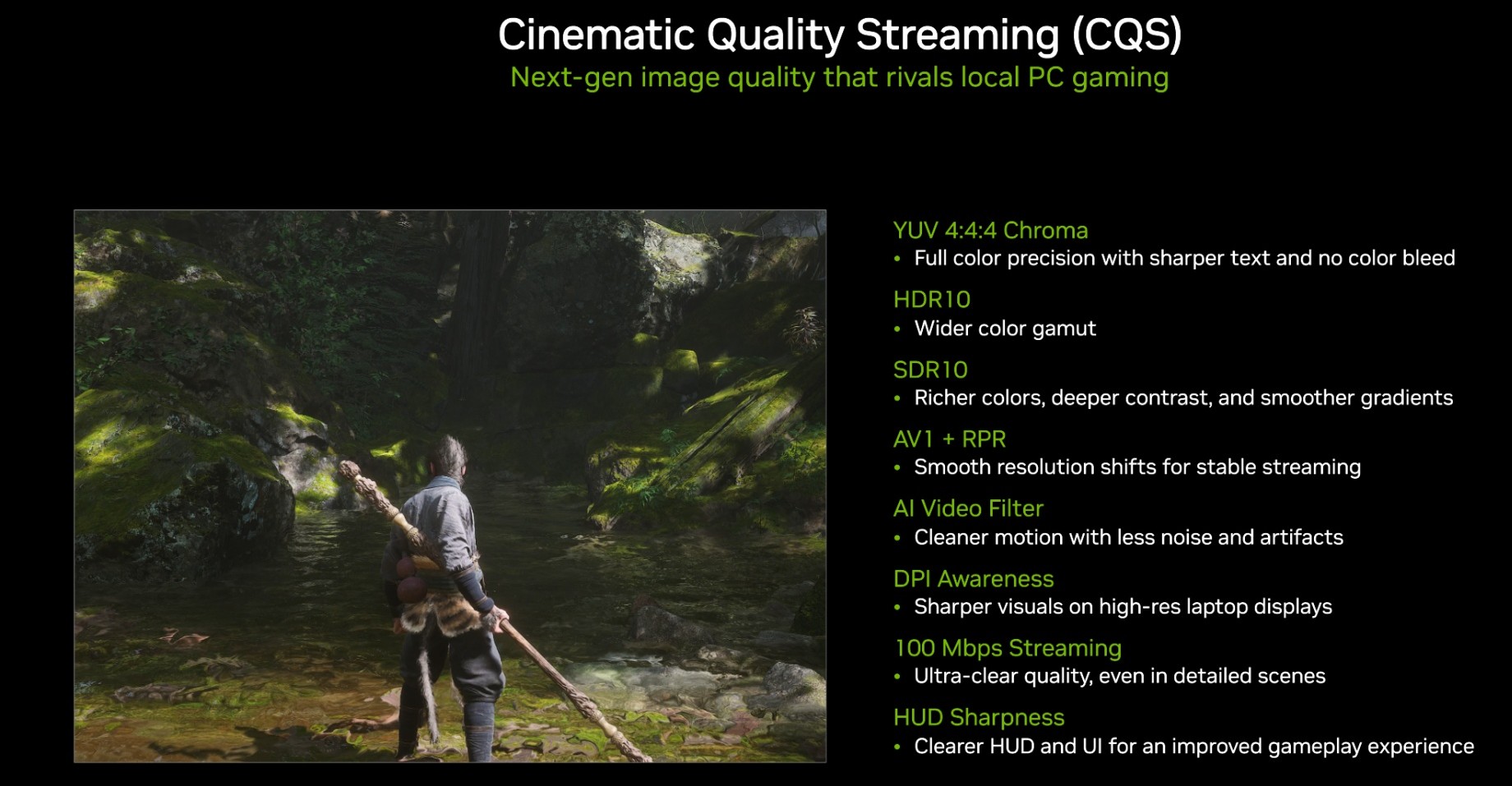Nový režim Cinematic Quality Streaming výrazne zlepšuje kvalitu grafiky vďaka technológii Blackwell, ktorá zaisťuje vysokú presnosť farieb a extrémne plynulé streamovanie. Podpora farebného modelu YUV s chroma vzorkovaním 4:4:4 a 10-bitovým dynamickým rozsahom prináša realistický obraz s bohatšími farbami, ostrejšími hranami a hlbším kontrastom – ideálne pre hry s podrobným textom a zložitými pozadiami, ako je bujná a bohatá vegetácia.