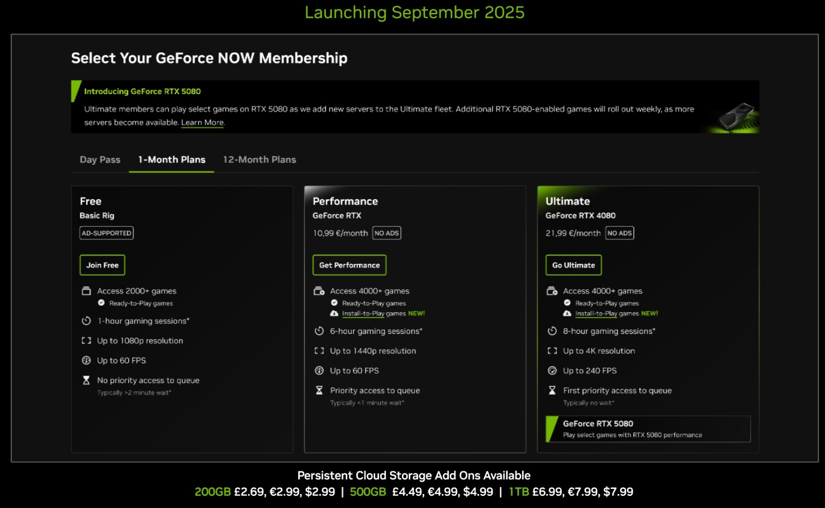 Aktualizácia GeForce NOW s architektúrou NVIDIA Blackwell bude spustená v septembri. GeForce NOW Ultimate zostáva k dispozícii za 19,99 $ mesačne alebo 99,99 $ na šesť mesiacov a zahŕňa prístup k serverom RTX 5080. Členstvo Performance zostáva k dispozícii za 9,99 $ mesačne alebo 49,99 $ na šesť mesiacov. Denné, mesačné a ročné členstvo bude k dispozícii od spustenia. Ročné členstvo bude k dispozícii za 199,99 $ a 99,99 $.