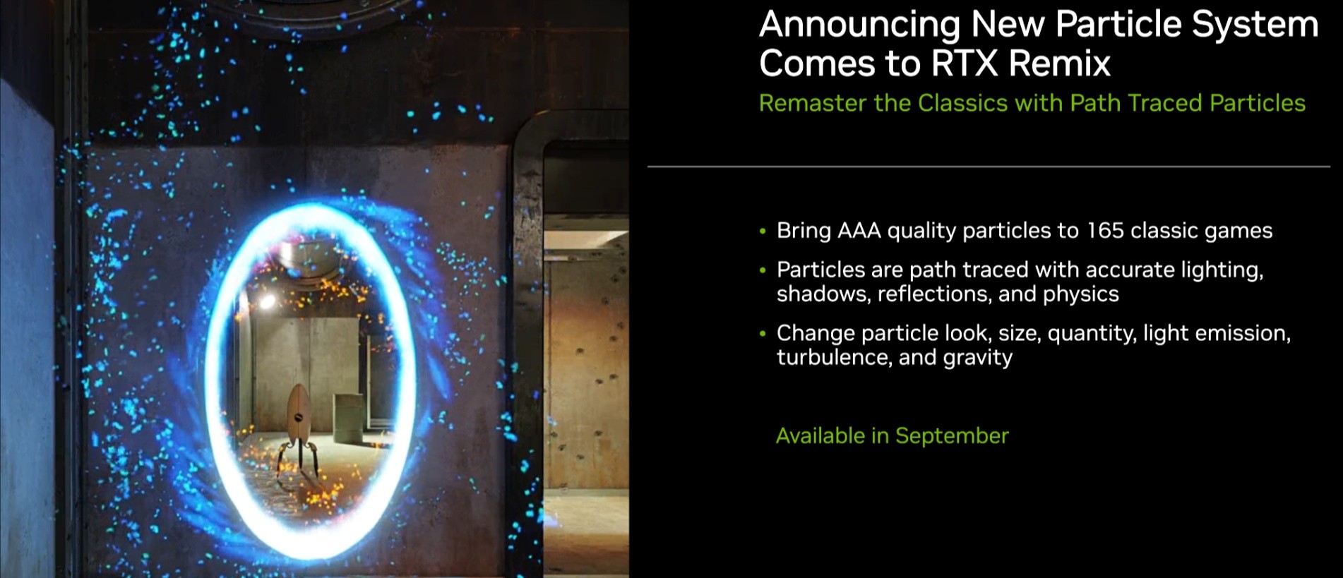 Na veľtrhu Gamescom spoločnosť NVIDIA taktiež predstavila pre RTX Remix nový systém častíc, ktorý prináša dynamické, realisticky osvetlené a fyzikálne presné častice do 165 klasických hier – z ktorých väčšina nikdy editor častíc nemala. Modderi môžu tento systém použiť na zmenu vzhľadu, veľkosti, množstva, svetelného vyžarovania, turbulencie a dokonca aj gravitácie častíc v hrách. Nový systém častíc bude k dispozícii v septembri.