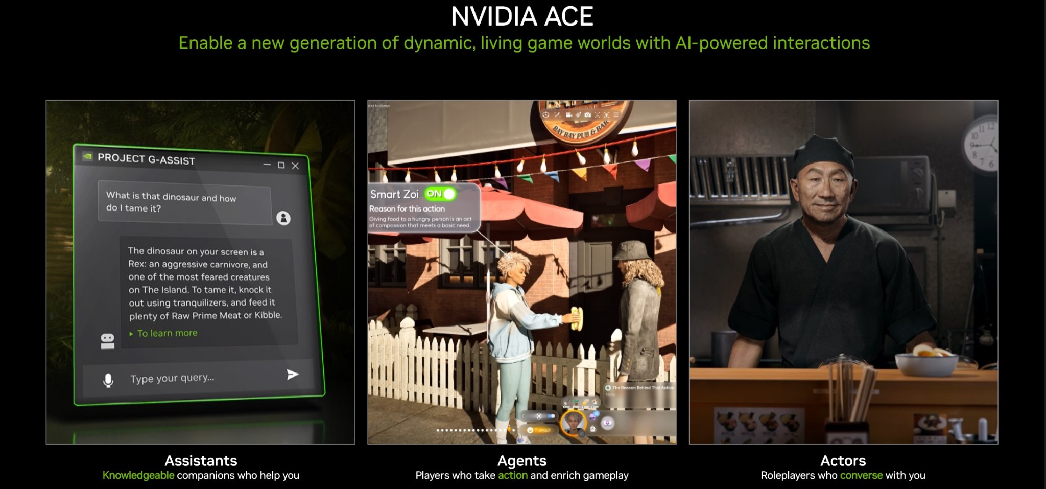NVIDIA ACE je sada generatívnych AI technológií, ktoré umožňujú realistické interakcie NPC v hrách, ako je Krafton's inZOI. Teraz je súčasťou hry The Oversight Bureau od Iconic Interactive, temnej satirickej logickej hry. Vďaka technológii prevodu reči na text poháňané ACE môžu hráči prirodzene komunikovať s postavami v hre pomocou prirodzenej reči. Narrative Engine od Iconic interpretuje vstup a vyberie najvhodnejší z vopred nahraných dialógov postáv, ktorý najlepšie zodpovedá príbehu a situácii.