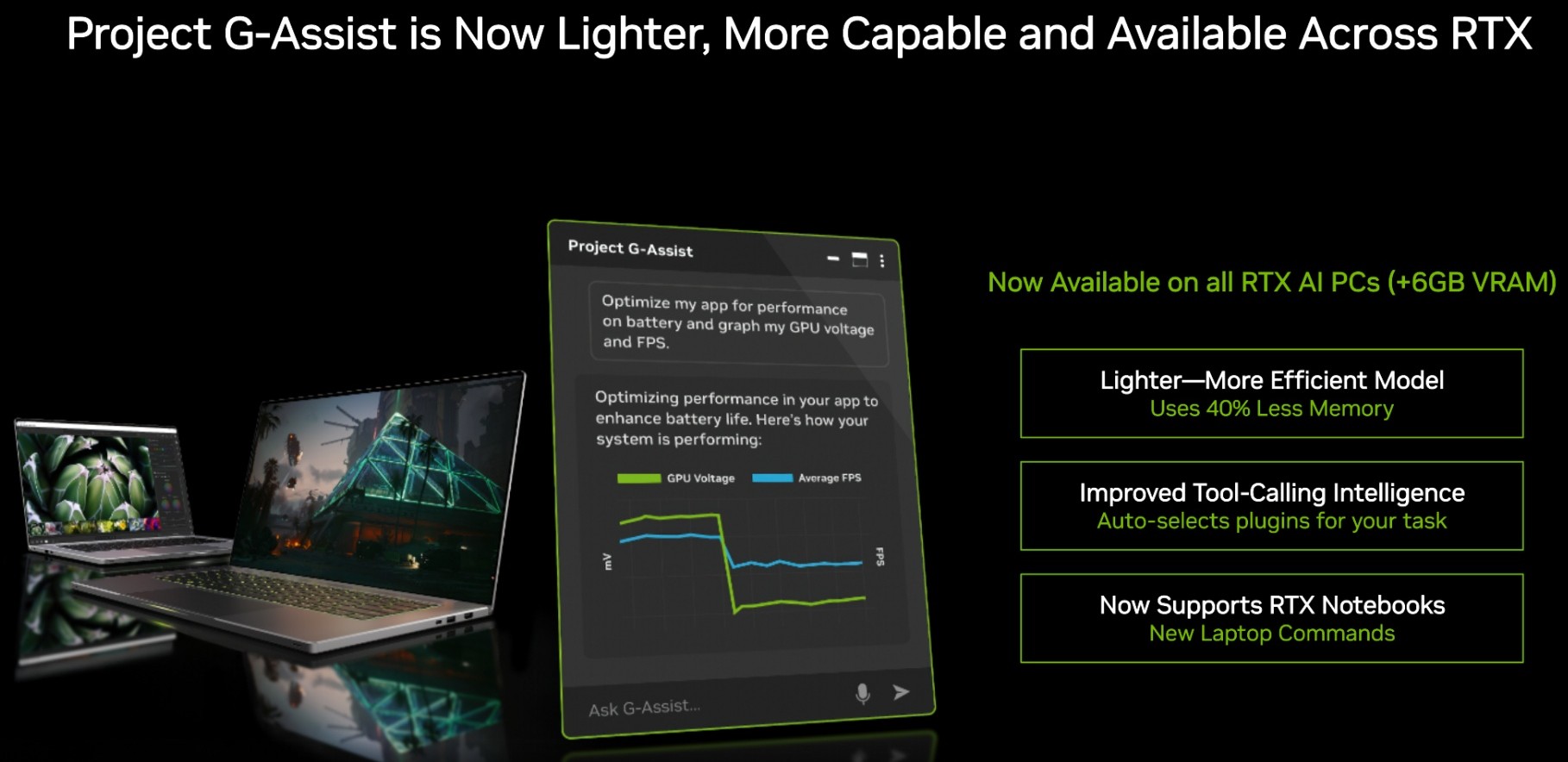 - vylepšený Project G-Assist: AI asistent pre hlasové a textové ovládanie RTX systémov teraz využíva o 40 % menej pamäte. Napriek menšej veľkosti zareaguje na otázky rýchlejšie a presnejšie volá správne nástroje.
