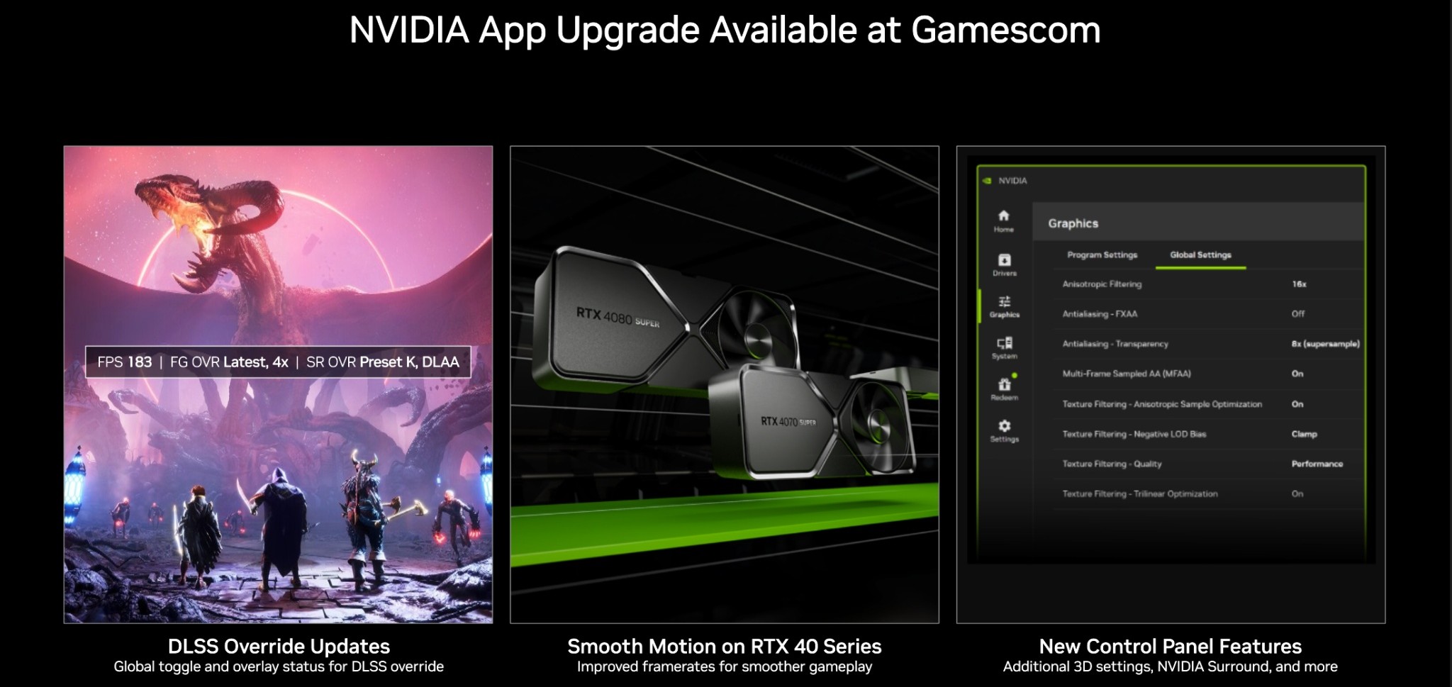- jednoduché zapnutie DLSS Multi-Frame Generation alebo Super Resolution naprieč stovkami hier, miesto individuálnej konfigurácie.