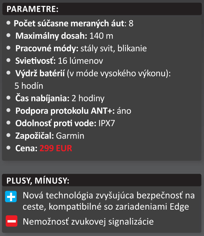 Pri testovaní sa nám zariadenie veľmi páčilo, robilo presne to, čo sľubuje. V súprave dostanete viacero úchytov, takže ho môžete používať striedavo aj na dvoch bicykloch. Indikácia fungovala spoľahlivo. Trošku nám chýbalo, že si nemožno nastaviť aj nejakú zvukovú signalizáciu prichádzajúceho auta. Predsa len nepozeráte stále na riadidlá. Ak ste vášnivý cykloturista a používate aj navigáciu, je dobré, že signál z radaru vedia prijímať aj navigačné prístroje radu Garmin Edge, tie potom upozornenia zobrazujú na okraji displeja. Preto možno jednotku radaru zakúpiť aj samostatne. Škoda, že výrobca do indikátora nezabudoval aj predné svetlo, mali by ste na riadidlách o jednu škatuľku menej. Výhodné je, že obe jednotky sú vybavené nabíjateľnými akumulátormi, výdrž oboch je okolo 5 hodín.