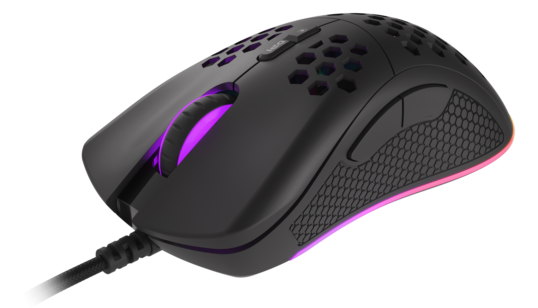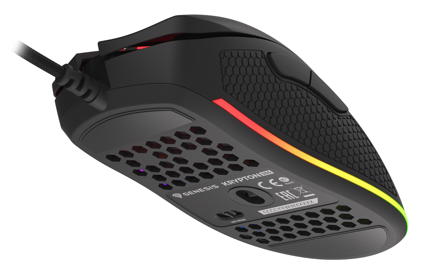 Hernú myš Genesis Krypton 555 som mal na test s podložkou Genesis Carbon 700XL s rozmermi 400 × 450 mm, ktorá je vhodným doplnkom, ďalej zvyšujúcim kvalitu hrania. Myš má pôsobivé špecifikácie, počínajúc inovatívnym senzorom PixArt PAW-3333, ktorý umožňuje nastavenie rozlíšenia v rozsahu 200 – 8000 DPI, cez rýchlosť reakcie 1000 Hz/1 ms, prepínače Kailh až po hmotnosť iba 70 g (bez kábla). Na atraktivite jej pridáva aj 7 konfigurovateľných tlačidiel a konfigurovateľné osvetlenie RGB v dvoch zónach. Čím však model Genesis Krypton 555 naozaj vyniká, je jeho dizajn. Telo je vyrobené z plastu ABS dierovaného v štýle včelieho medového plástu, ktorý nielen dodáva estetický vzhľad, ale aj znižuje hmotnosť myši. Veľmi dobre ho dopĺňa podsvietenie RGB nastaviteľné v dvoch zónach. Prvou je tenký pásik, ktorý sa tiahne zľava doprava po obvode spodnej časti okrem prednej strany. Druhú tvorí podsvietenie kolieska a podsvietenie dlaňovej časti, ktoré presvitá cez otvory. Aj keď Krypton 555 nie je najľahšia myš na trhu, jej hmotnosť 70 g je v porovnaní s inými ultra-light myšami stále veľmi konkurencieschopná. Vďaka svojmu vyššiemu telu a ergonomickému tvaru je táto myš nielen skvelá na dlhé hranie, ale aj pri pohybe sa zdá ľahšia, ako napovedá jej hmotnosť.
