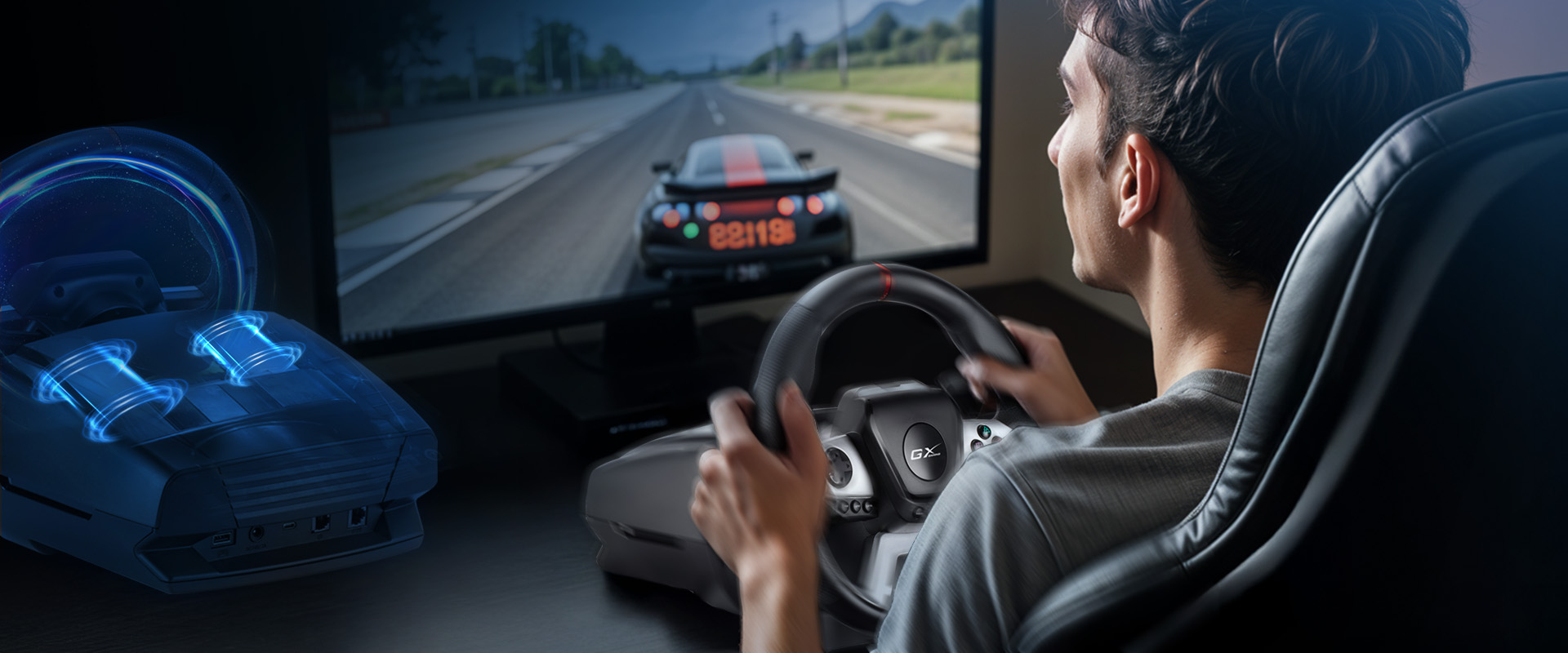 Technológia spätnej väzby force feedback spolupracuje v podporovaných hrách s fyzikálnym a zvukovým herným enginom, aby hráčom sprostredkovala maximálne verný pocit ako zo skutočných pretekov. Podporovaný je režim D-Inpux a X Input. Režimy sa prepínajú v aplikácii alebo dlhším pridržaním tlačidla Home pod volantom. Na vysvetlenie: D-Input (DirectInput) je starší štandard od Microsoftu, ktorý umožňuje pripojenie rôznych typov ovládačov. Podpora v moderných hrách je obmedzená, pretože od éry Xbox 360 Microsoft prešiel na X-Input, kde sa zariadenie identifikuje ako Xbox gamepad. Hra okamžite rozpozná volant bez potreby mapovania tlačidiel. Na prvý pohľad by mal byť novší štandard lepší, ale nie je to tak. X-Input má pevne daný počet osí a tlačidiel, prispôsobený ovládaču Xboxu. Preto niektoré špecifické funkcie volantu, napríklad viac ako dva pedále, H radenie, sa v X-Inpute nemusia zobraziť alebo fungujú len čiastočne. Herné volanty a joysticky s mnohými osami a tlačidlami môžu byť v D-Inpute flexibilnejšie, pretože dokážu odosielať viac vstupov, napr. samostatnú spojku, extra prepínače, sekvenčné radenie a podobne. V režime D-Input môžete mať plnú funkcionalitu všetkých pedálov, radenia a prepínačov, ale nie každá moderná hra to podporí – často treba manuálne nastaviť ovládanie. Súpravu som testoval na hre Forza Horizon 5 a niekoľkých jednoduchších hrách na PC v obidvoch režimoch, takže som si mohol vychutnať „len“ klasický force feedback.