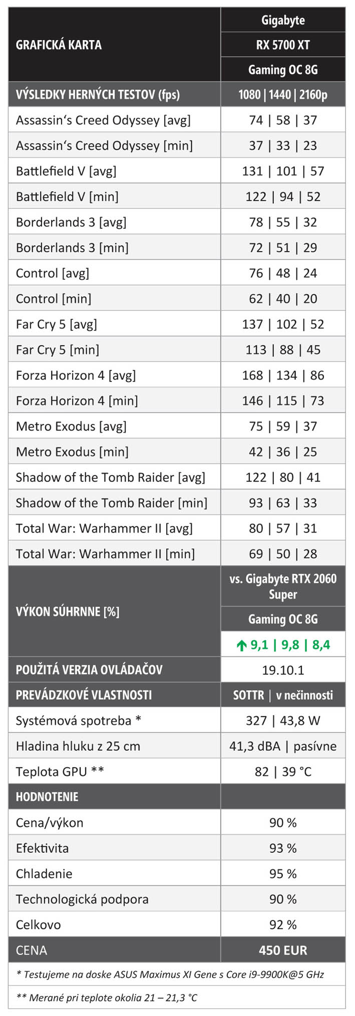 Súhrnné tabuľkové porovnanie výkonu prezrádza, že je karta RX 5700 XT výrazne výkonnejšia ako RTX 2060 Super v rovnakom vyhotovení (Gigabyte Gaming OC). V závislosti od rozlíšenia je plusových 8,4 – 9,1 % na úrovni triedy. S výnimkou Controlu (a i tam je ten rozdiel v prospech RTX 2060 Super zanedbateľný) beží drvivá väčšina hier rýchlejšie na RX 5700 XT. Dokonca aj Assassin's Creed Odyssey, ktorý si drží stabilnejší framerate a celkovo funguje lepšie na grafických kartách GeForce.