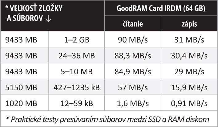GoodRAM vydal nové pamäťovky pod hlavičkou svojej firemnej značky IRDM. V zmenšenom (microSDXC) i nezmenšenom formáte (SDXC) v kapacitách 32 – 128 GB. Všetky podliehajú štandardu UHS-I v triede U3/V30. To znamená, že zápis musí dosahovať aspoň 30 MB/s. Pri testovanom variante SDXC so 64 GB sa uvádza zápis 40 MB/s. V praxi takúto rýchlosť karta nedosahuje ani špičkovo, no nejde o nič nezvyčajné, takéto prikrášľovanie praktizujú aj iní výrobcovia. Najvyššia dosahovaná prenosová rýchlosť zápisu v prierezovom teste ATTO zodpovedá 35,7 MB/s (pri 32-megabajtovom súbore).