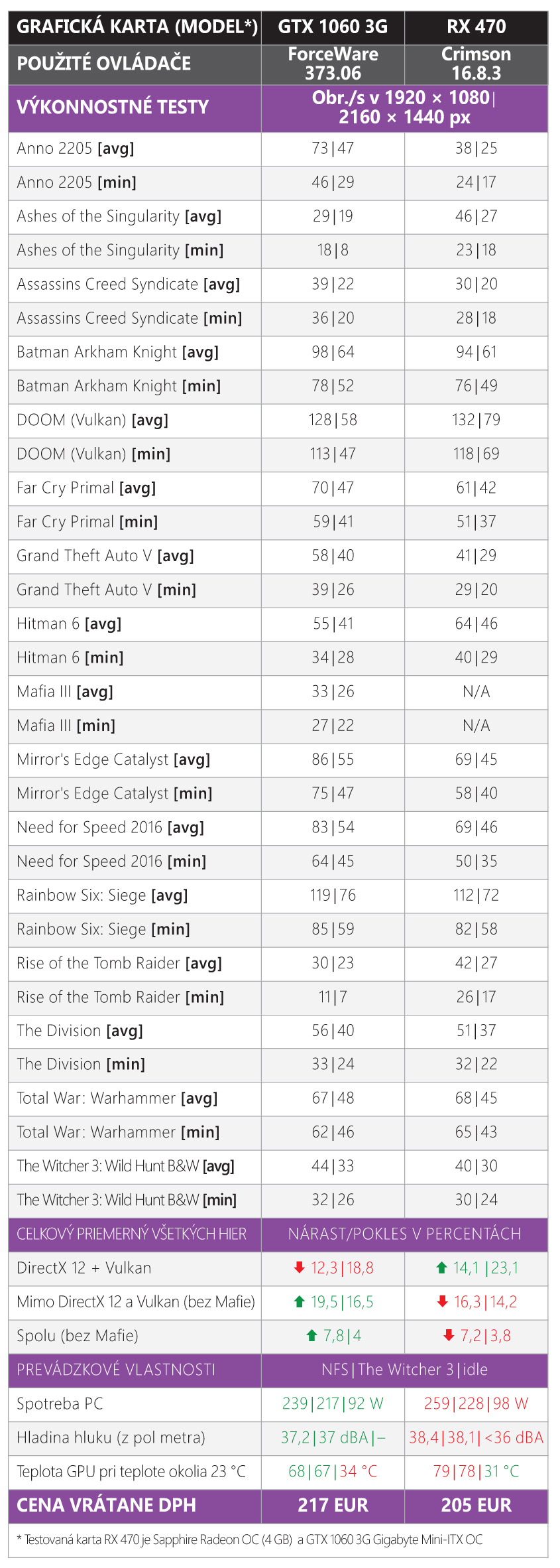 Herný výkon je v priemere o 17 – 20 % vyšší ako pri RX 470, a to aj v 1440p, v tomto rozlíšení však s menším nárastom než vo FHD. No najväčší problém je vyváženosť. Zatiaľ čo s 80 % hier si poradí výborne, zvyšok je už viac alebo menej problematický. Priepastné a pomerne nevyspytateľné prepady fps sme zaznamenali v Grant Theft Aute. Chvíľu hra beží v poriadku, potom sa však framerate z 50 náhle prepadne na 15 a znovu sa vracia do normálu, čo výrazne kazí pôžitok z hrania. To sa, samozrejme, netýka nižších detailov, ktoré sa zmestia v nastaveniach do 3 GB. Stále je to však lepší stav ako pri konštantne nehrateľnom AotS alebo spomalenom Rise of the Tomb Raider (pozn.: zatiaľ čo kapacitne rozdielne RX 460 narážajú v TR na obmedzený výkon GPU, tu je preukázateľne vinníčkou nedostačujúca videopamäť). Radeon RX 470 je oproti GTX 1060 s 3 GB v priemere síce pomalšia karta, ale dôležité je, že netrpí výraznými výkyvmi. Ak vás zaujíma, aký je rozdiel medzi 3 a 6 GB GTX 1060, v septembrovom čísle si môžete nalistovať stranu 69 a porovnať tabuľkové výsledky.