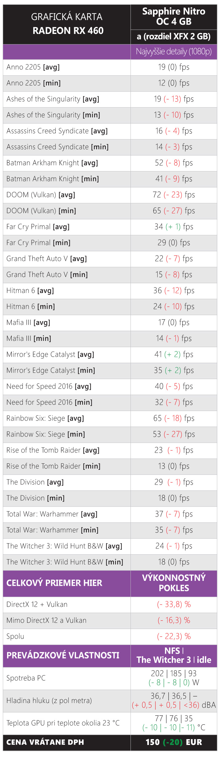 Grafické jadro RX 460 je pomerne výkonné a niektorými titulmi prechádza pri 1920 × 1080 bodoch i v najvyšších nastaveniach ako nôž maslom. Pekný príklad sú hry DOOM a Rainbox Six: Siege, ktoré zvláda v priemere nad 60 fps, z ktorých dokáže dvojgigabajtová XFX ukrojiť až okolo 30 %. A obzvlášť nepríjemný je tu 40 až 50-percentný pokles minimálnych fps. Do metodiky sme doplnili aj októbrový hit – Mafiu III (s patchom 1.01), ktorá patrí k náročnejším hrám a na plynulý chod je zníženie detailov bez ohľadu na veľkosť pamäte nevyhnutné. Výkon nepridávajú ani ovládače Crimson 10.0.1, ktoré ako prvé túto hru oficiálne podporujú.