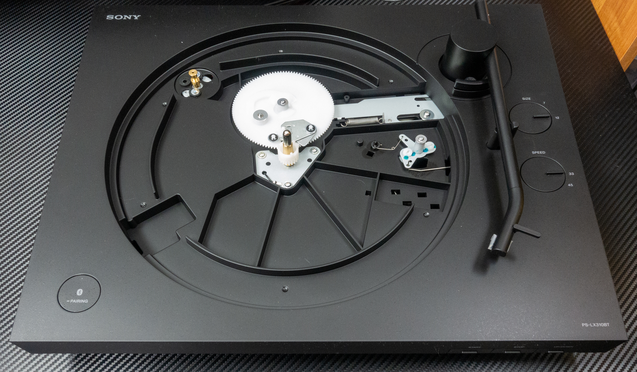 Pred nasadením taniera si môžete všimnúť sústavu bielych ozubených kolies a kovových kulís, ktoré slúžia na ovládanie pohybu ramienka prenosky. Tento mechanizmus využíva pohon taniera, takže to vysvetľuje zvuky pri spúšťaní prenosky. Ovládacie tlačidlá na prednom paneli sú čisto mechanické a ich zatlačením aktivujete mechanizmus pohybu prenosky. Počas prehrávania je tento mechanizmus vyradený, takže počúvanie nie je ničím rušené. Rýchlosť otáčania medzi 33.3 otáčkami za minútu pre LP platne a 45 otáčkami pre single sa prepína elektronicky. Gramofón je napájaný z externého zdroja, čo eliminuje prípadné rušenie z elektrickej siete