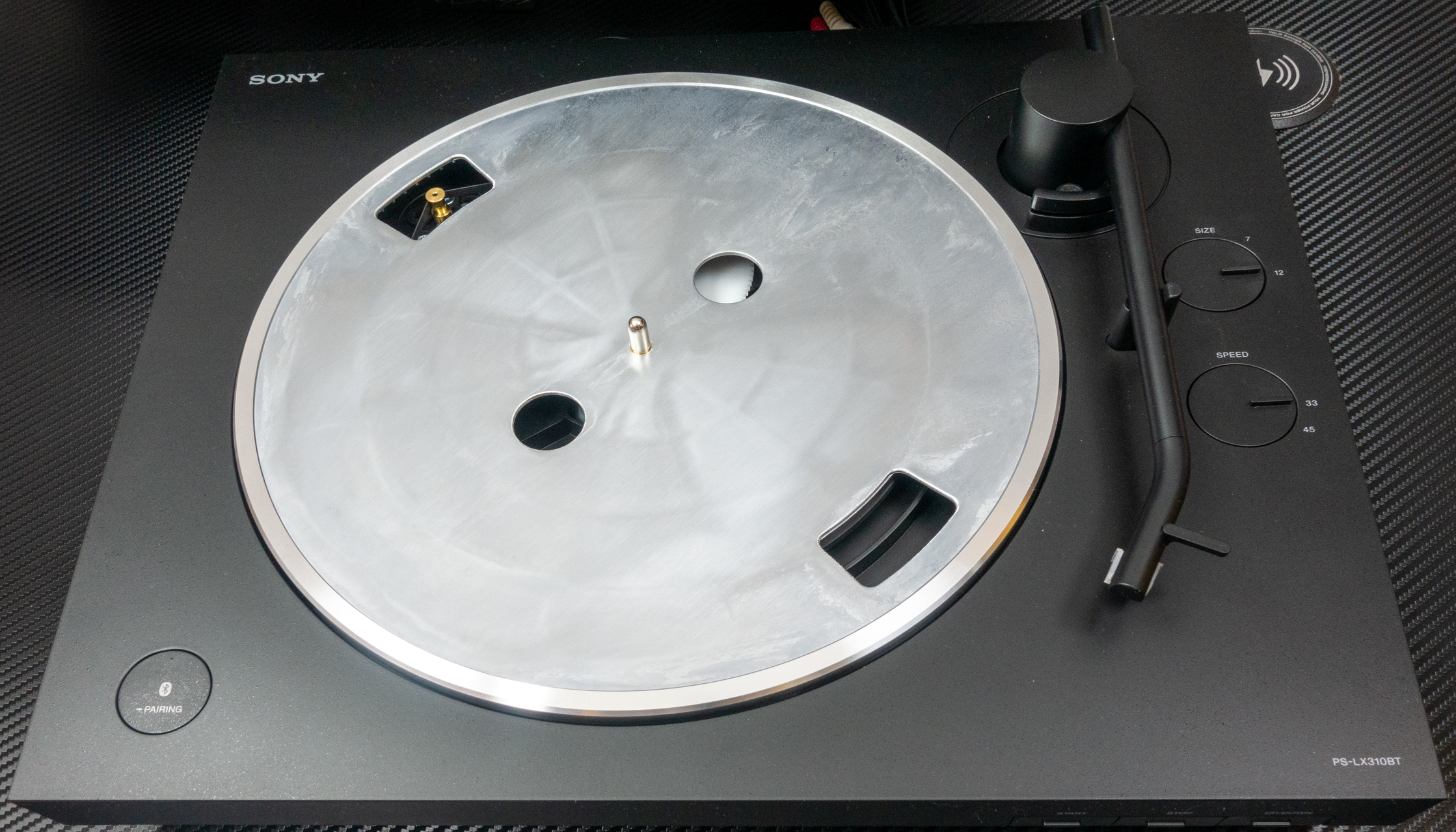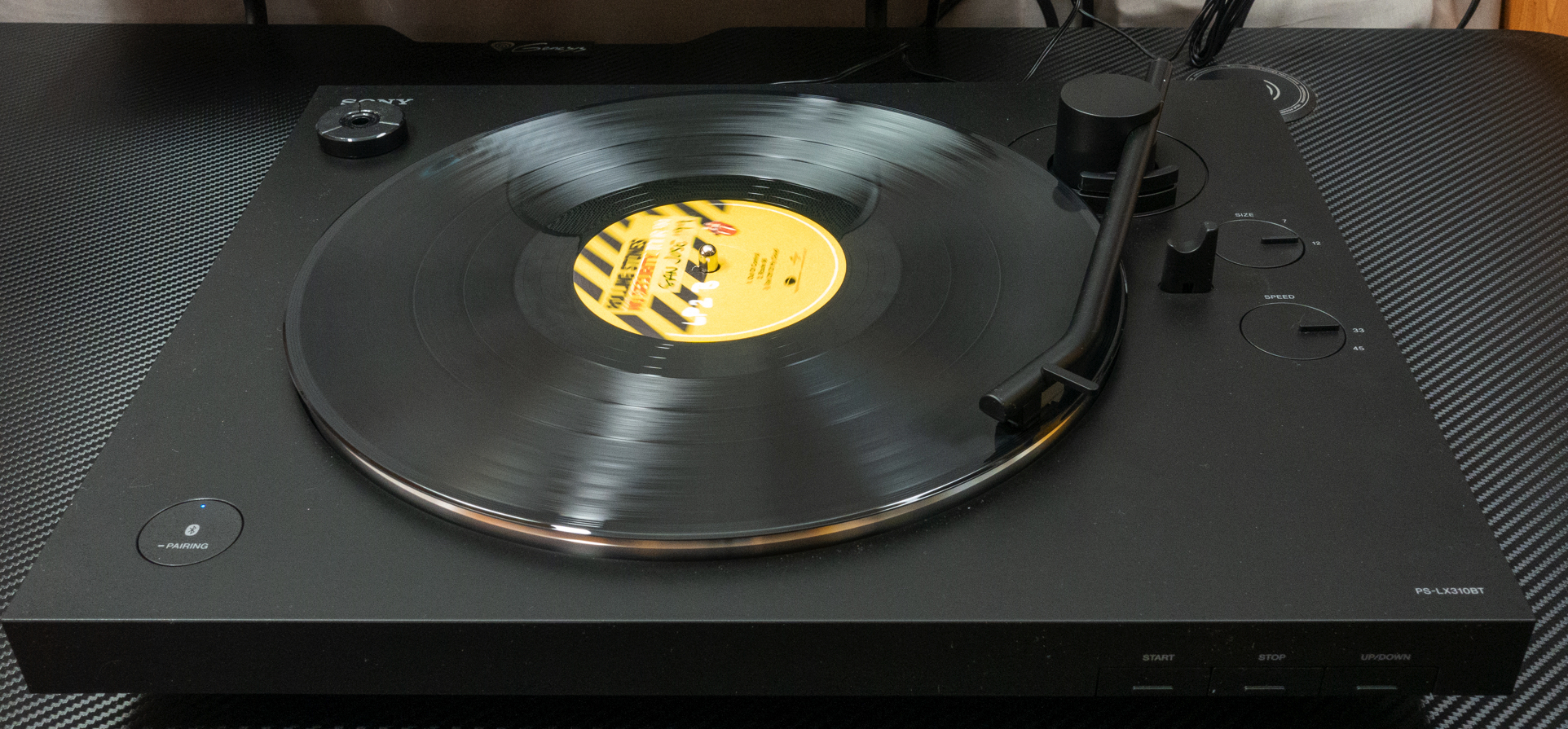 Sony PS-LX310 BT je plne automatický gramofón, to znamená, že stačí položiť LP platňu na tanier, otrieť ju antistatickou utierkou, zatvoriť plexisklový kryt proti prachu a stlačiť tlačidlo Štart. Gramofón sa už postará o zvyšok. Otočí ramienko prenosky nad počiatočnú drážku platne a spustí prenosku do drážky. Po dohraní strany platne sa ramienko automaticky zodvihne a vráti do východiskovej polohy. Tlačidlo Stop umožňuje prehrávanie kedykoľvek ukončiť. U gramofónov vyšších cenových tried budete takúto automatiku márne hľadať, pretože ako som vysvetlil v úvode, ochudobnila by vás o zmyslové pôžitky z ovládania prehrávania. Nakoľko veľa mladších záujemcov nemá s prehrávaním platní skúsenosti plne automatický gramofón je pre nich dobrým kompromisom. Tento gramofón nemá implementovanú funkciu prechodu nad nasledujúcu, alebo zvolenú skladbu. Má však tlačidlo Up/Down, ktoré zodvihne prenosku a počas držania tlačidla ju môžete posunúť nad začiatok požadovanej skladby. Keď vám gramofón niekoľko krát „ukáže“ ako sa to robí, môžete umiestniť ramienko prenosky do úvodnej drážky, prípadne na požadovanú skladbu sami. Akonáhle začnete ramienkom pohybovať smerom k stredu platne, zapne sa pohon taniera a spustí kulisa, ktorá inak pridržiava ramienko nad platňou.