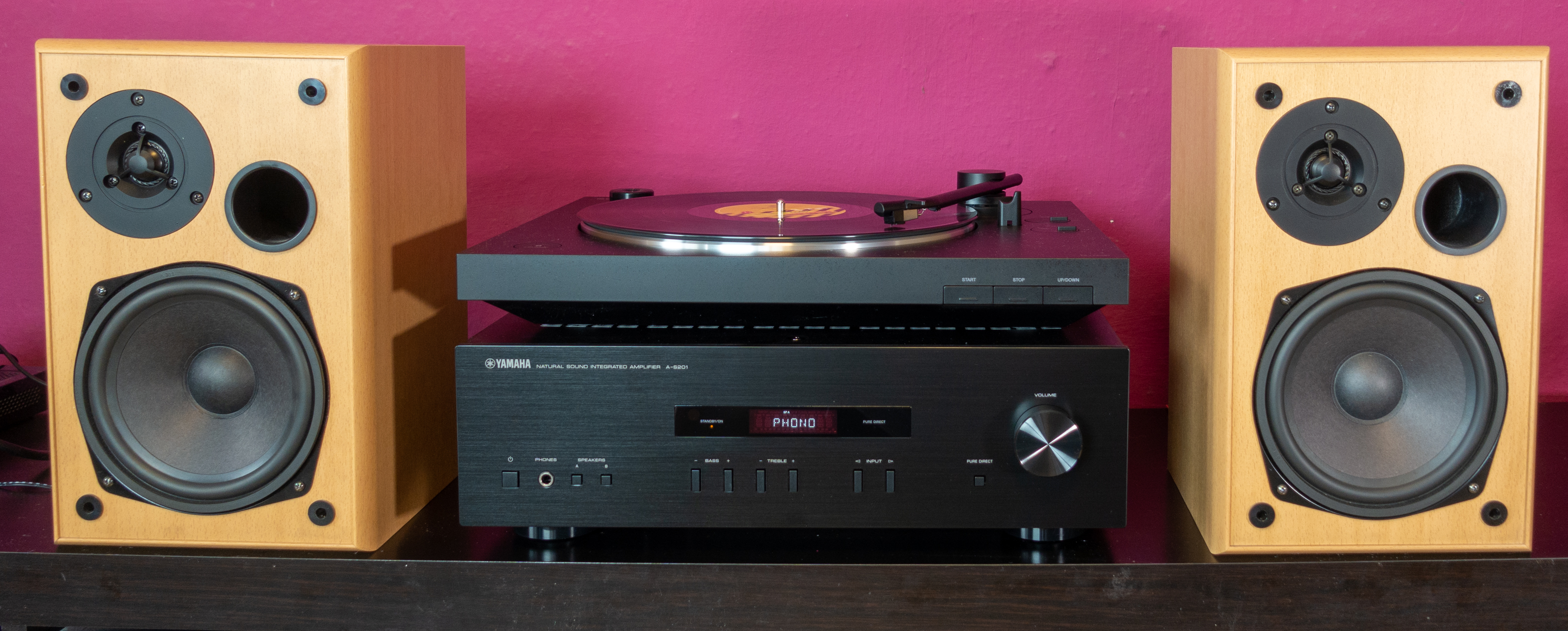 Potom som testovaciu zostavu upgradoval a použil zosilňovač Yamaha A-S201, ktorý už má aj vstup pre gramofón s magnetodynamickou prenoskou a trojpásmové reproduktory rovnakej značky.
