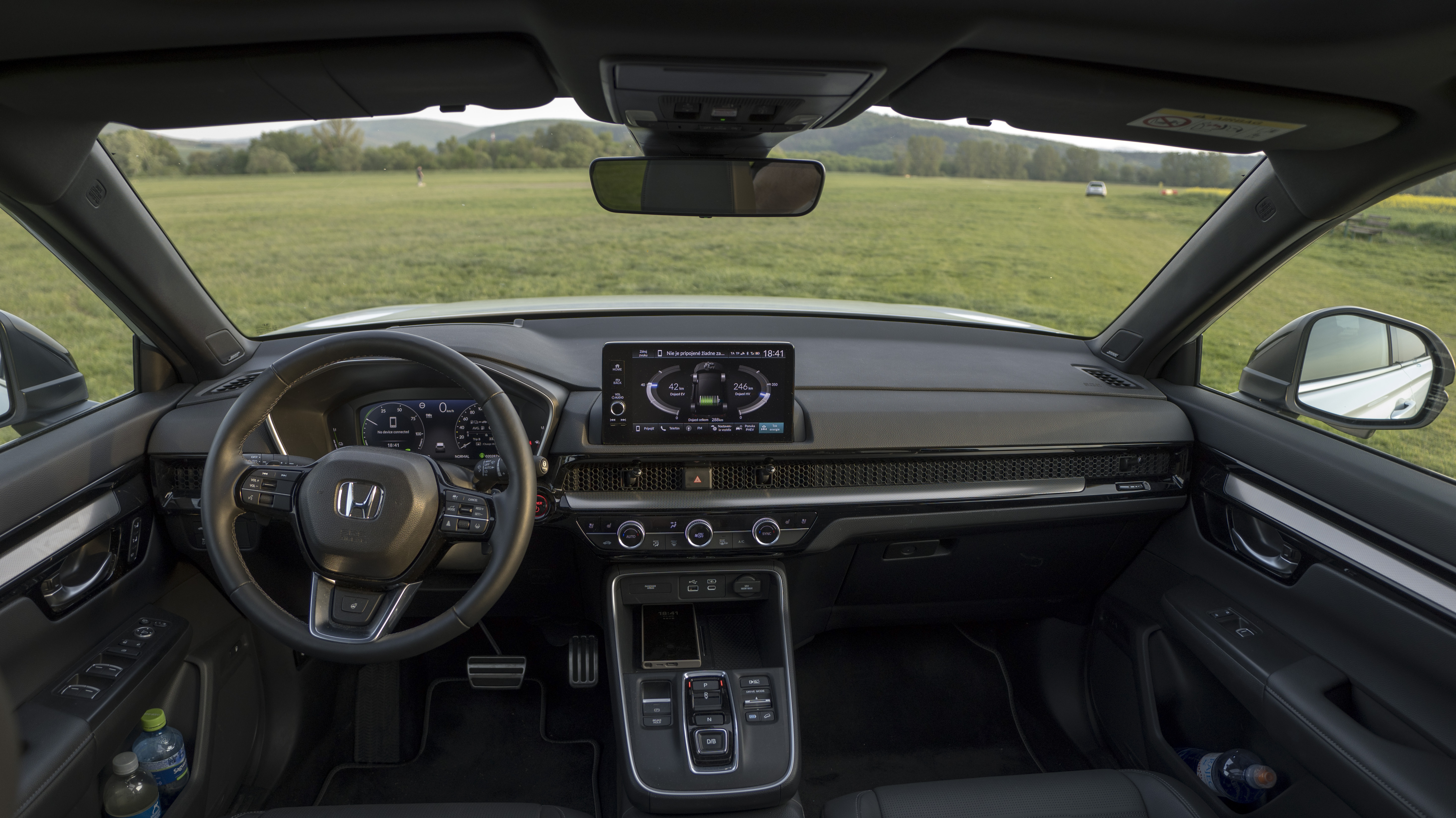 Výkon nabíjania je však asi jediná výhrada pri tomto vozidle. HONDA CR-V e:PHEV inak predstavuje kombináciu špičkového dizajnu, pokročilých technológií a udržateľných riešení. Ide nielen o efektívne a bezpečné, ale aj pohodlné a štýlové vozidlo. Veľmi pekný dizajn s výraznou rovnou prednou maskou s mohutným rebrovaním dáva vozidlu vážny výraz, ktorý je zvýraznený úzkymi, vysoko posadenými svetlami a pásikmi denného LED osvetlenia a adaptívnymi svetlometmi. Celé osvetlenie je, samozrejme, zverené LED technológii. Po usadnutí do kabíny prekvapí pekne spracovaný interiér, ktorý síce nehýri prémiovými materiálmi, ale je dobre a prakticky usporiadaný a bez nepraktických lesklých povrchov. Všetky ovládacie prvky sú iba mechanické a šikovne usporiadané. Volič jazdných režimov na stredovej konzole pozostáva z viacerých tlačidiel usporiadaných tak ako v ostatných modeloch Honda a po krátkom oboznámení sa s ním rýchlo zžijete. Vedľa neho nájdete aj ovládanie systému Parking Pilot, ktorý je k dispozícii špeciálne iba pre verziu e:PHEV, prepínanie jazdných módov, prepínanie režimov plug-in hybridného systému, ktorý môže byť nastavený na EV, Auto alebo Save, keď udržuje nabitie batérie. K dispozícii je priehradka na mobil s bezdrôtovým nabíjaním a dvojica USB, jeden vo verzii C iba na nabíjanie a verzia USB-A na pripojenie Android Auto a Apple CarPlay. Bezdrôtovo to nejde.