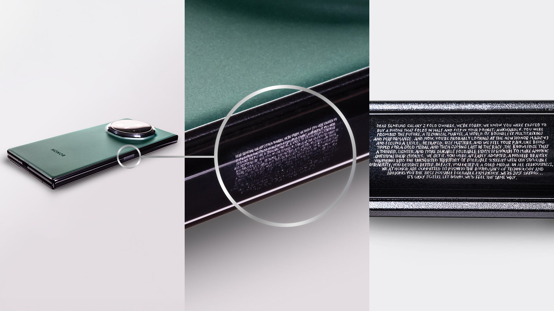 Na štíhly pánt HONOR Magic V3 bolo ručne vygravírované ospravedlnenie v rozsahu 166 slov