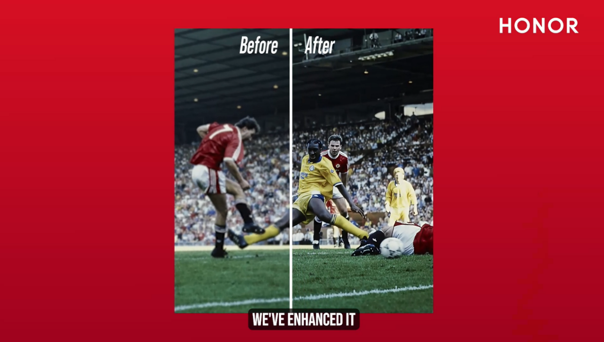 Nový HONOR Magic7 Pro podporovaný mobilnou platformou Snapdragon® 8 Elite ponúka širokú škálu výkonných AI funkcií pre fotografovanie - od AI Super Zoom, AI Vylepšený potrét až po AI Snímanie pohybu. Funkcia AI Upscale je novinkou, ktorá umožňuje používateľom ľahko obnoviť poškodené alebo vyblednuté staré portrétne fotografie odstránením škrabancov, zvýšením rozlíšenia a zlepšením jasnosti. Vďaka AI Upscale na HONOR Magic7 Pro sa podarilo obnoviť a vylepšiť viac ako 40 fotografií z archívov Old Trafford, pričom vyblednuté pamiatky premenili na vyleštené snímky vhodné pre 21. storočie.