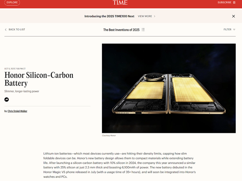 Druhé ocenenie získala spoločnosť HONOR za prelom v oblasti batériových technológií. Nový dizajn batérie prekonáva limity hustoty energie klasických lítiovo-iónových článkov a umožňuje ešte tenšie skladacie zariadenia s dlhšou výdržou.