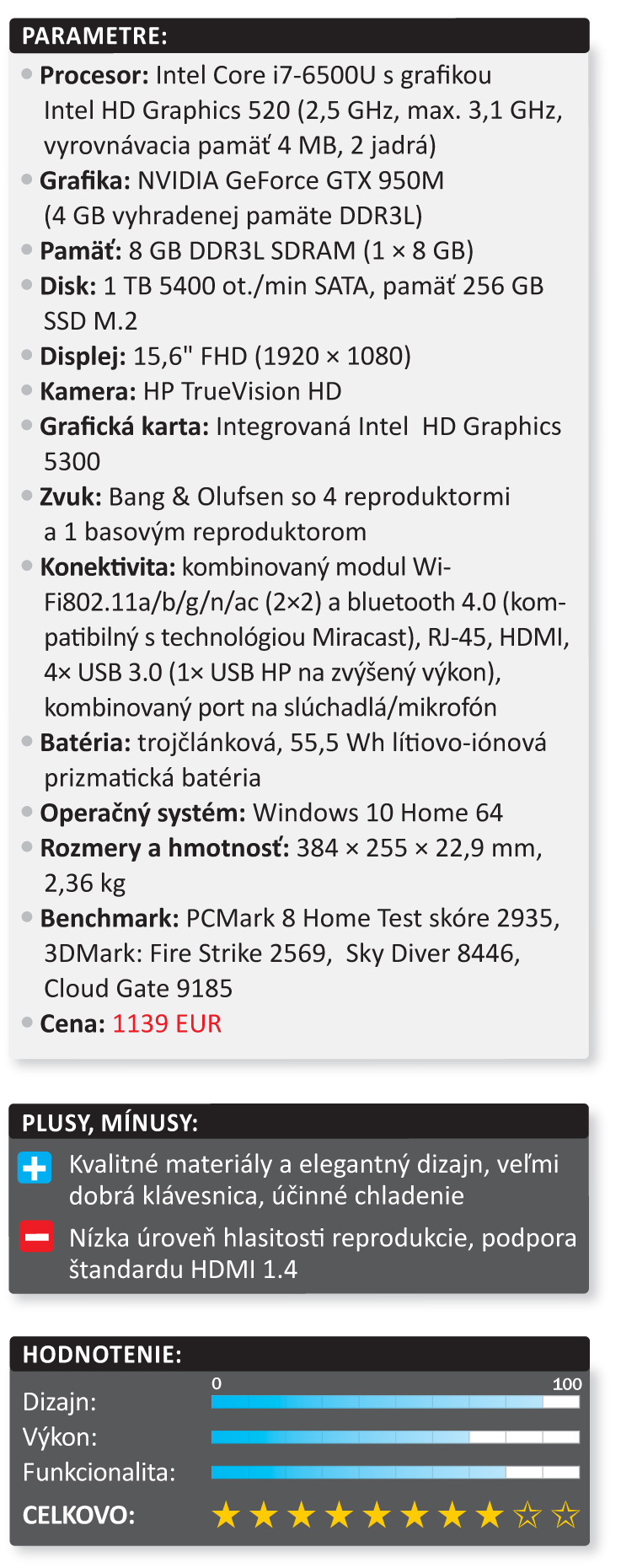 Absencia dotykového ovládania umožnila použiť matný displej IPS. Rozsah pozorovacích uhlov je dobrý, no na testovacích obrazcoch sme postrehli, že najsvetlejšie odtiene sa v prípade niektorých farieb už nedajú rozlíšiť. Pri bežnej práci má zobrazovanie na starosti integrovaná grafika Intel HD 520, pri hrách a náročných aplikáciách sa aktivuje dedikovaná grafika NVIDIA GeForce GTX 950M, ktorá má k dispozícii 4 GB vlastnej RAM. Náruživých hráčov asi neuspokojí, ale väčšinu hier zvládne aj v natívnom rozlíšení full HD, pri tých náročnejších treba na dosiahnutie rozumnej obnovovacej frekvencie znížiť rozlíšenie napríklad na 1366 × 768.