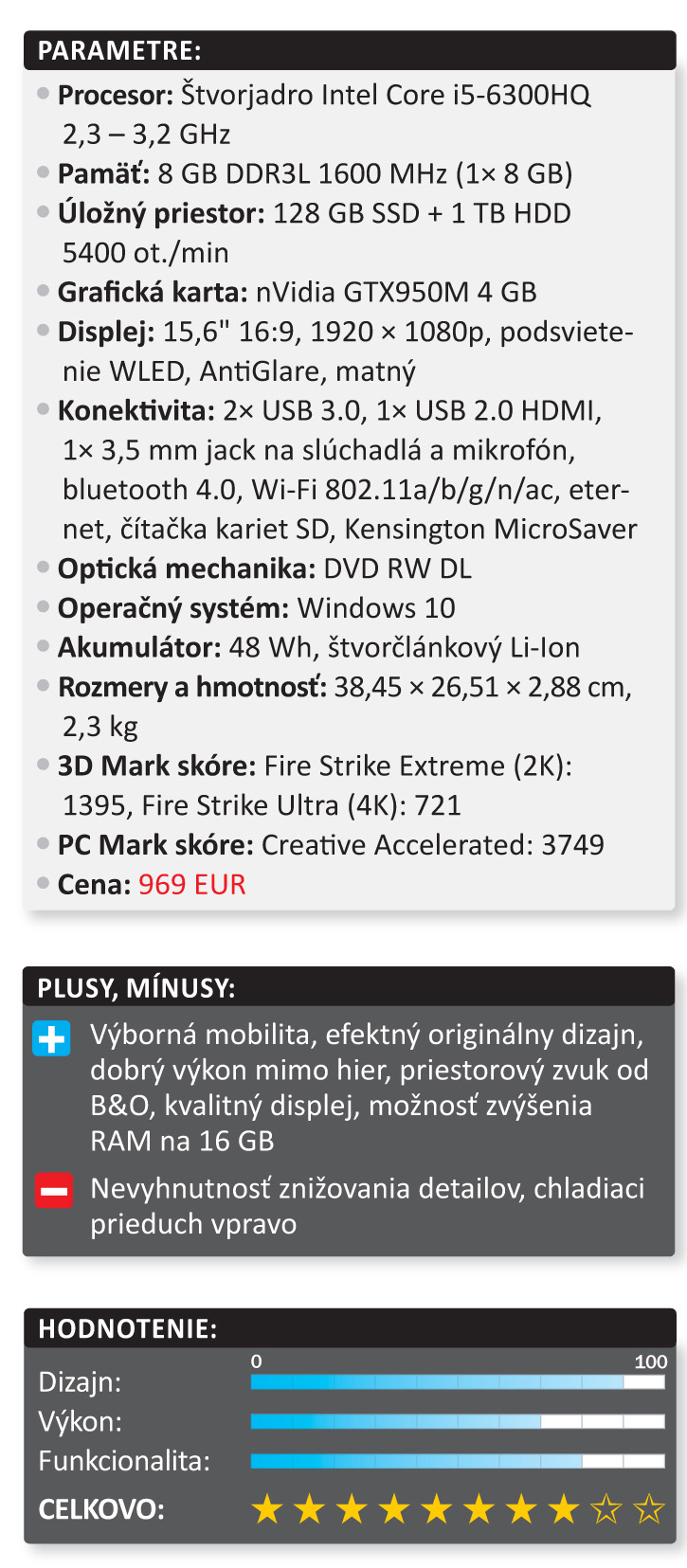 Úložný priestor je dvojaký. SSD s kapacitou 128 GB dáva svižnosť operačnému systému (v tomto prípade Windows 10) a postačí na uloženie dvoch či troch hier. Po vyčerpaní tohto miesta budú musieť ďalšie hry putovať na klasický dátový disk s kapacitou 1 TB. Srdcom notebooku je štvorjadrový procesor radu i5, a tak je výkon pri činnosti mimo hier dobrý. 8 GB RAM zatiaľ postačuje na všetky účely, no do budúcnosti je tu možnosť zvýšenia. Zberatelia škatuľových variantov hier sa isto potešia, že svoj priestor v zariadení našla aj mechanika DVD.