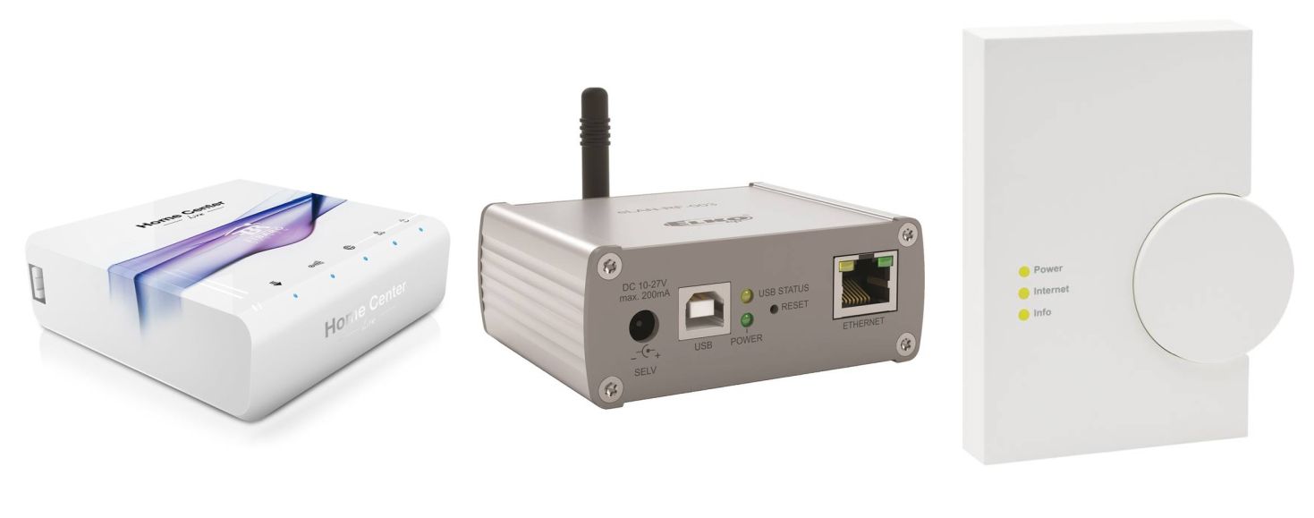 Zľava: Ovládacie centrá pre smart domácnosti Fibaro Home Center Lite, eLAN-RF-003 a HomeMatic Central Control Unit (CCU2).