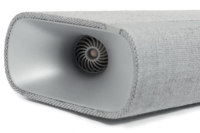 Soundbar s typickým tvarom podlhovastého hranola vybočuje z radu svojimi zaoblenými hranami a useknutými koncami, v ktorých sa nachádzajú lievikovité výduchy efektových reproduktorov, smerujúce dopredu. Telo je okrem zadnej strany potiahnuté balistickou tkaninou, ktorú vpredu hore dopĺňa kovová lišta slúžiaca na jej upevnenie.