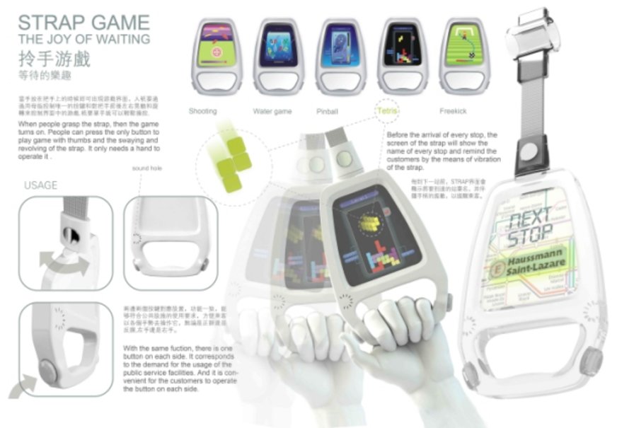 Koncept zariadenia s názvom Game Strap je jednoduchý – herný systém je integrovaný priamo do držadla, ktoré nájdete v autobusoch alebo električkách. Konzola sa automaticky zapne, keď sa používateľ chytí držadla, pričom zariadenie je vybavené tlačidlom na oboch stranách na pohodlné hranie pomocou jednej ruky. Držadlo je s tyčou prepojené pomocou remienka, a tak sa Game Strap môže v malom rozsahu čiastočne pohybovať spoločne s používateľom.
