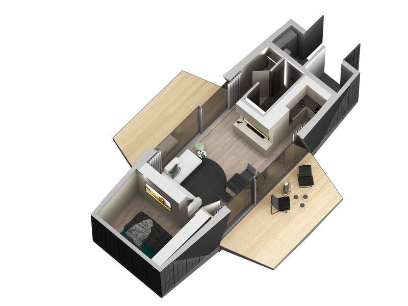 iOhouse opisuje Space ako „off-grid moderný koncept životného priestoru“.