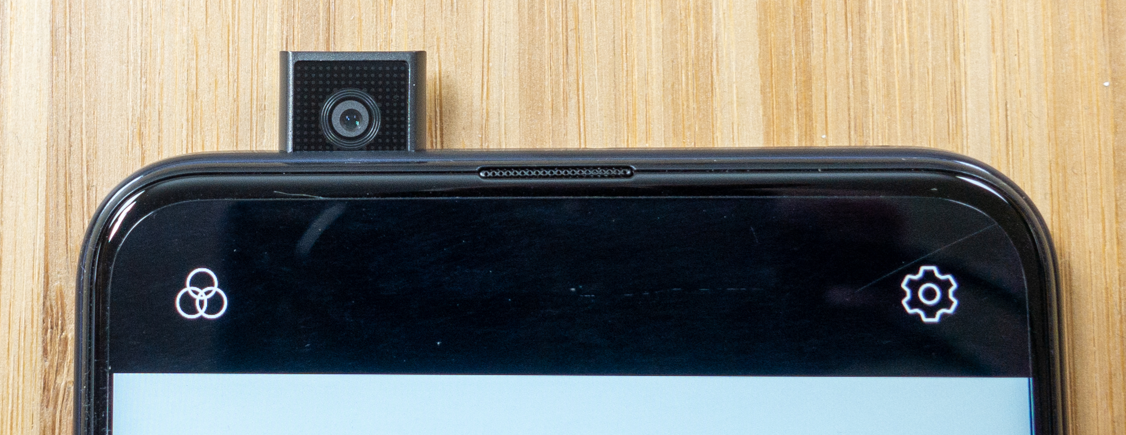 Jedným z lákadiel recenzovaného smartfónu je vysúvací modul so selfie fotoaparátom, takže displej môže až na veľmi tenké rámiky zabrať celú plochu prednej steny bez akéhokoľvek výrezu, či otvoru. Nakoľko objektív prednej kamery je zasunutý, nemôže z princípu fungovať odomknutie smartfónu rozpoznaním tváre.