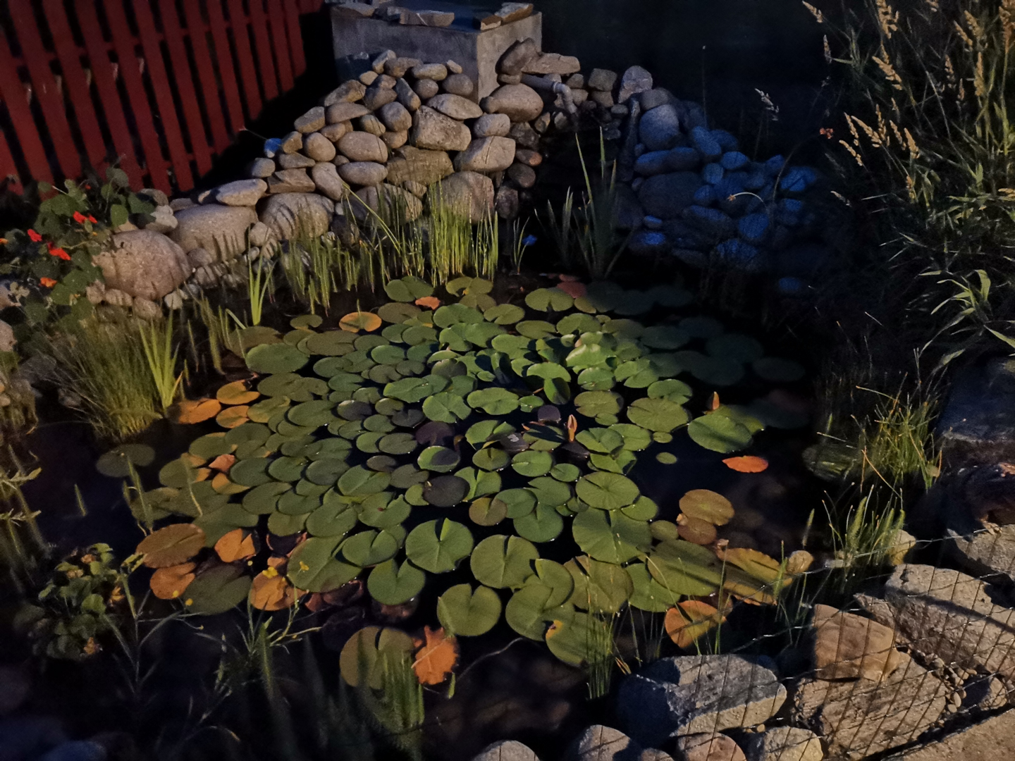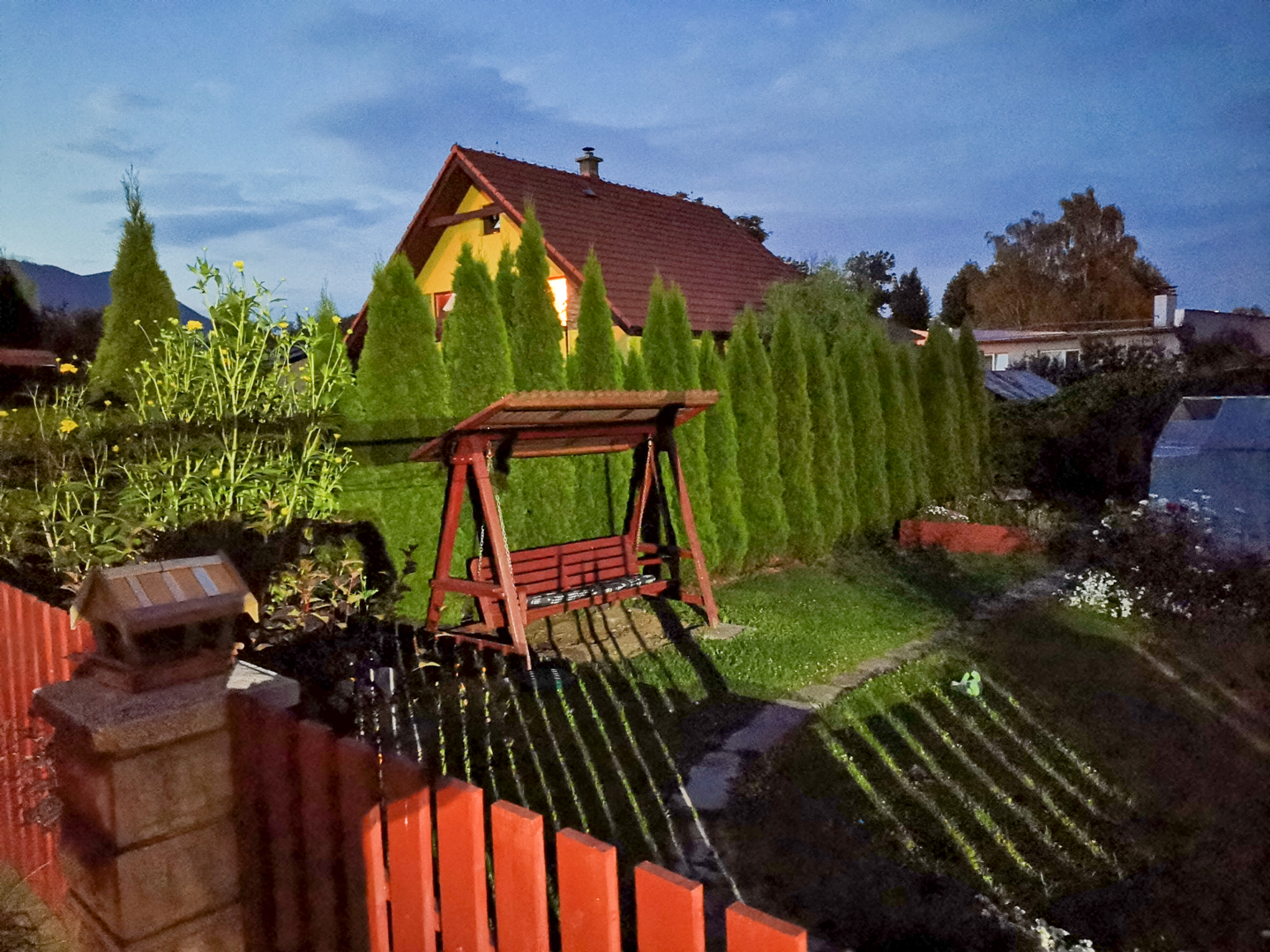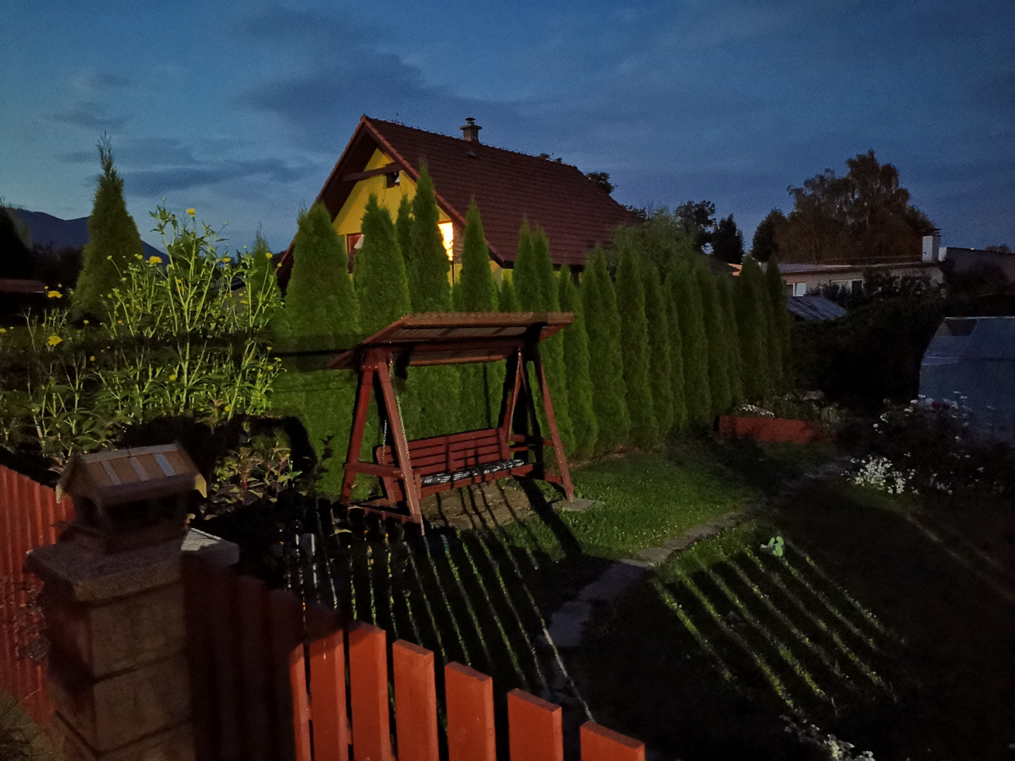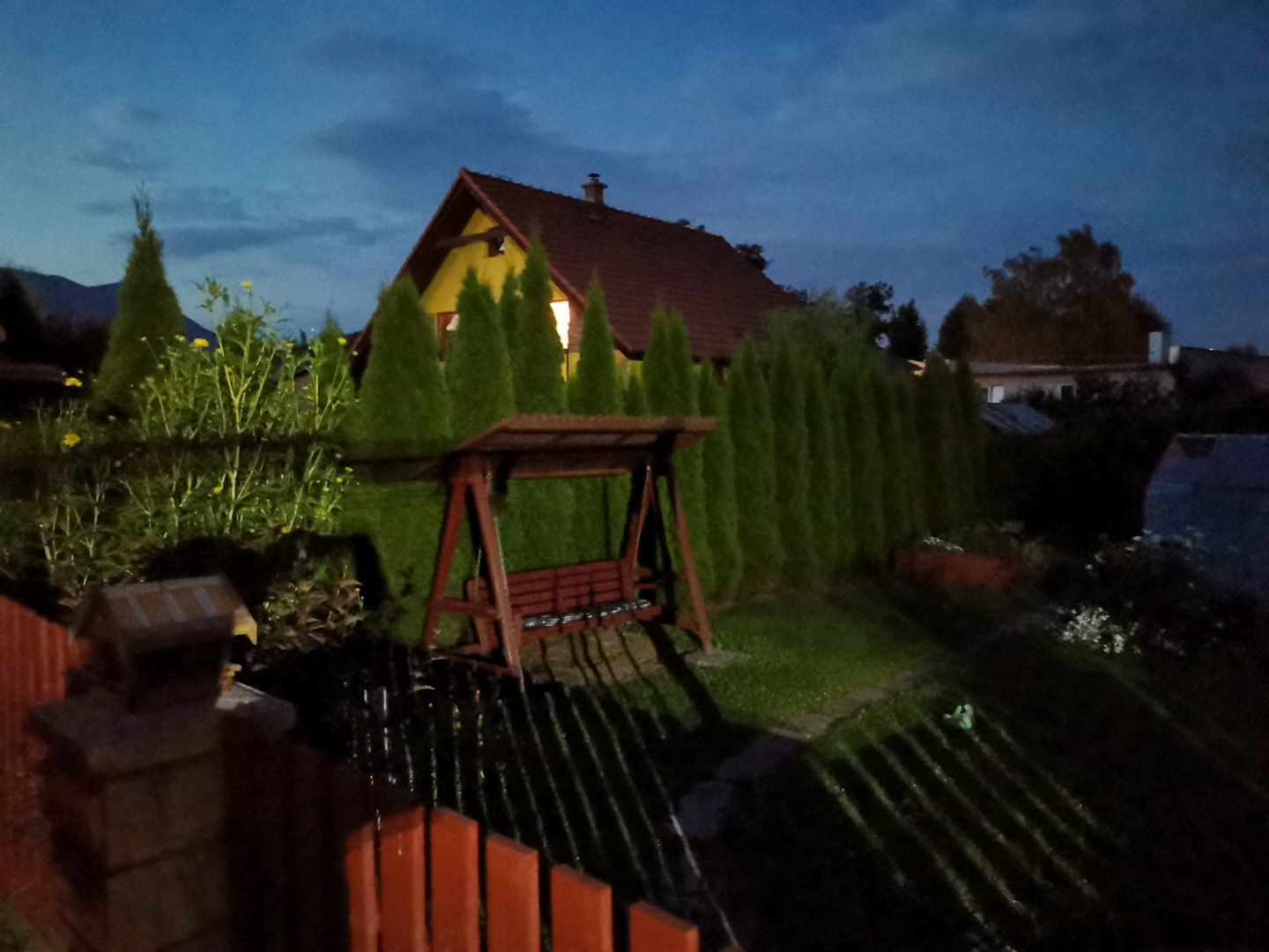Vľavo obrázok zosnímaný v nočnom režime, vpravo obrázok upravený v aplikácii Galéria. Záber je zosnímaný pri osvetlení malou záhradnou solárnou LED lampou